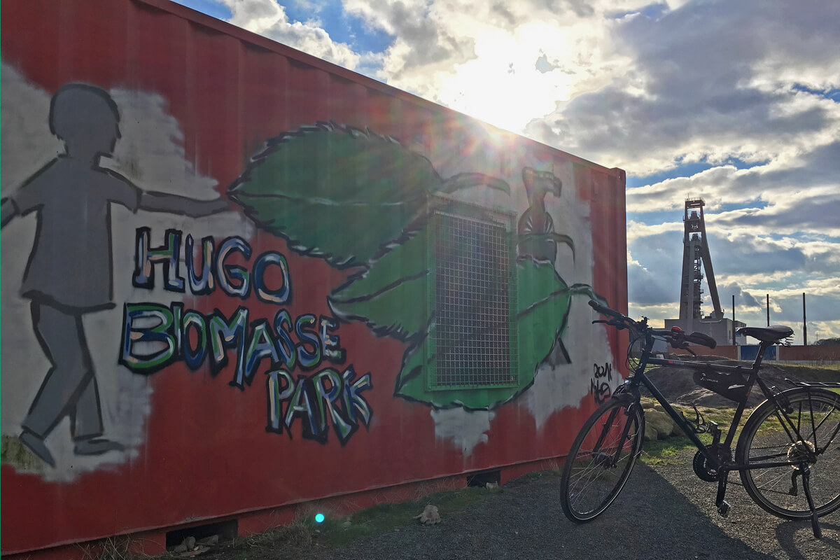Zunächst ist die Wegequalität noch ausbaufähig, später fahre ich aber auf bestem Asphalt. Dabei passiere ich immer wieder interessante Bergbau-Exponate. Die Trasse verläuft vorbei an den Zechengeländen von König-Ludwig I/II und IV/V und weiteren Relikten des Industriezeitalters wie der Fabrik „Waggonbau Heinrich Wilhelm“. Auch aktive Betriebe liegen hin und wieder noch am Wegesrand. Alles ist nicht ganz so rausgeputzt, stattdessen erlebe ich das typische, ehrliche Ruhrgebiet. Für mich springt die König-Ludwig-Trasse grade auf Platz 1 meiner Lieblingsbahntrassen im radrevier.ruhr.