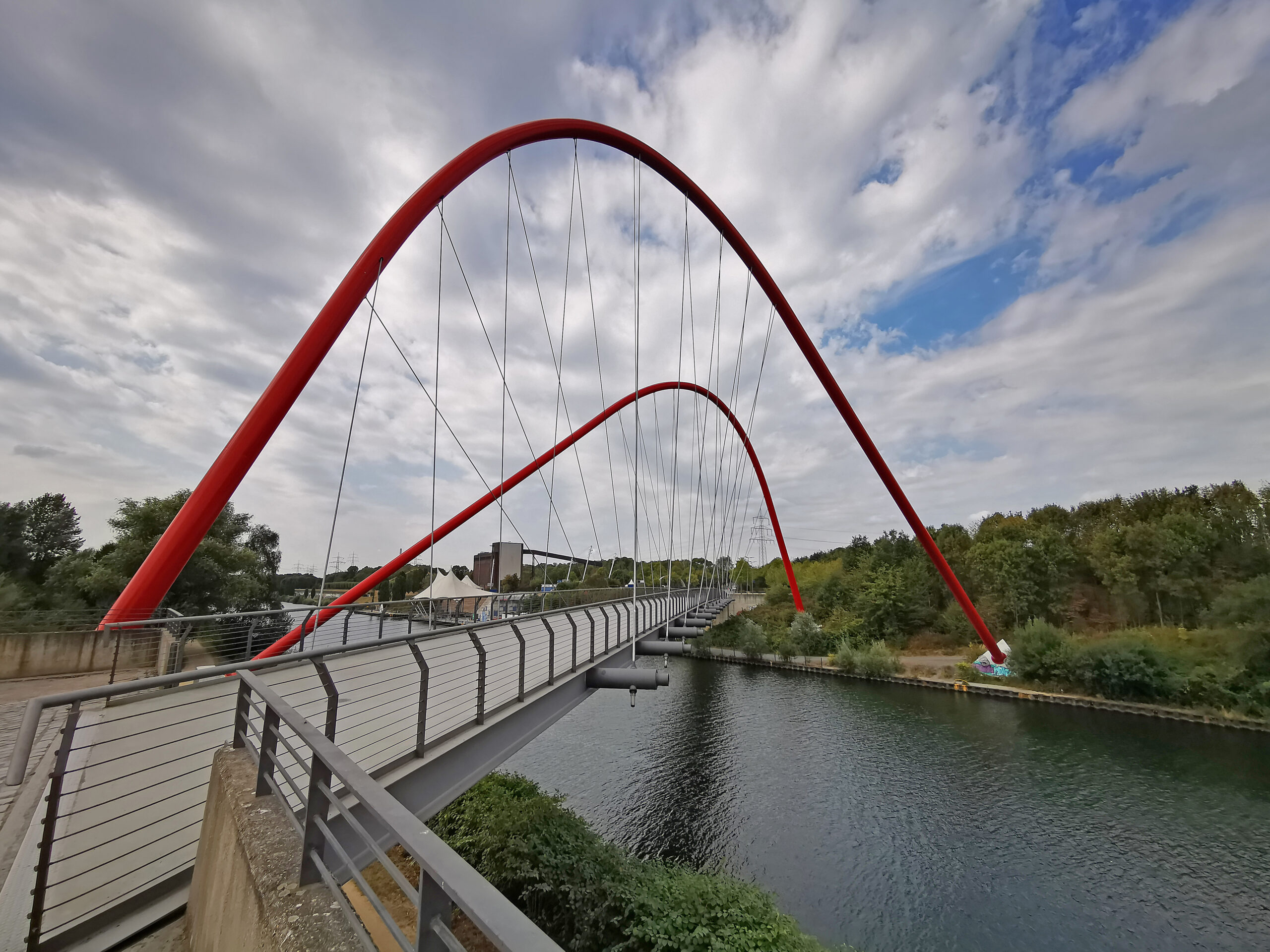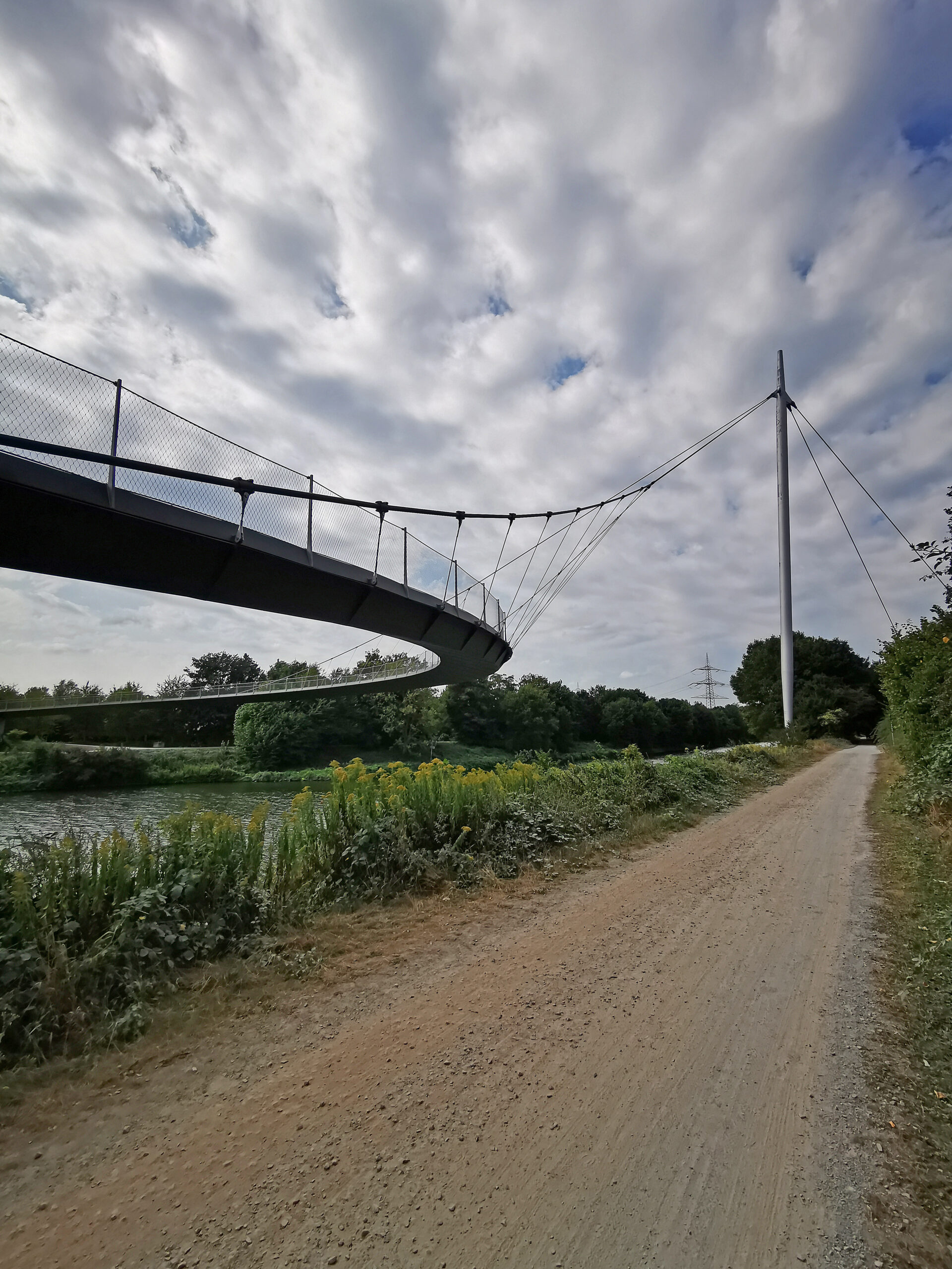 Ein kurzer Sprung über eine Autokreuzung, dann geht es auf den Emscher-Weg. Schnell ist die markante Brückenkonstruktion der Grimberger Sichel erreicht. Nach einem kurzen Stück am Kanal fahre ich wieder recht gradlinig neben der Emscher. Es ist unter der Woche und fast nichts los, sodass die Tachonadel auch mal länger im 30er Bereich sein kann.