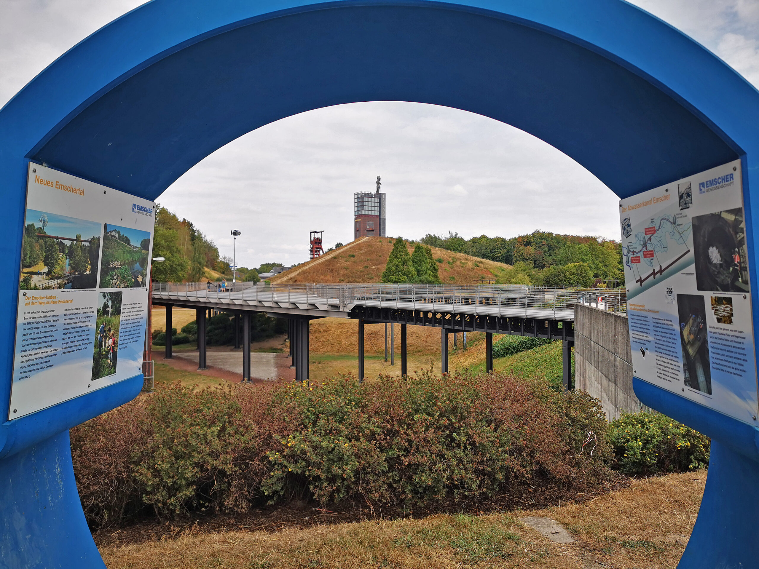 Ich bin im sportlichsten Teilstück der Tour und stehe vor der Haldenlandschaft der Brauker Alpen. Über einen netten Uferweg gelange ich zur Halde Mathias Stinnes (54 hm), die schnell erklommen ist und eine Aussichtsplattform der Grünen Hauptstadt bereithält.