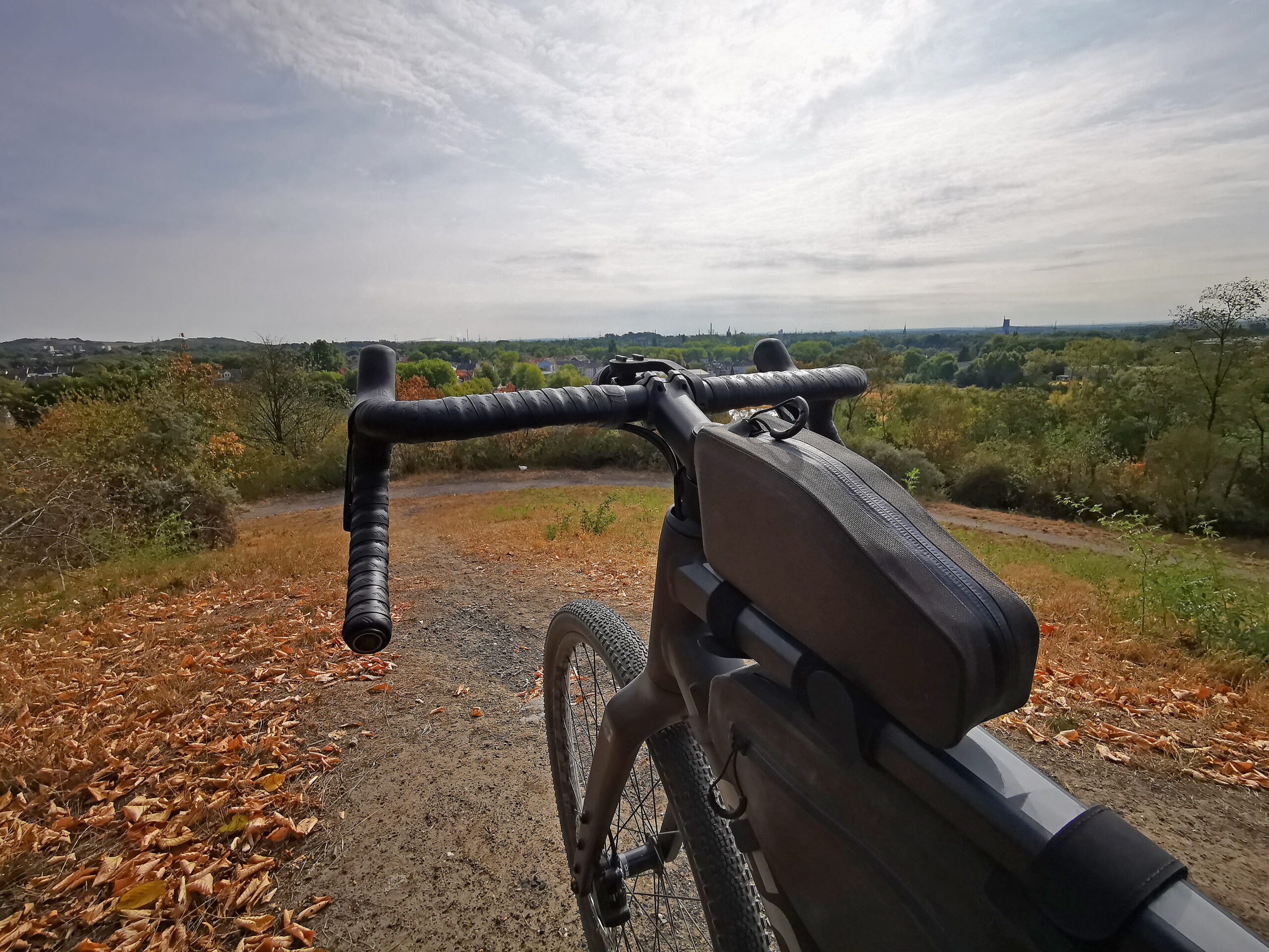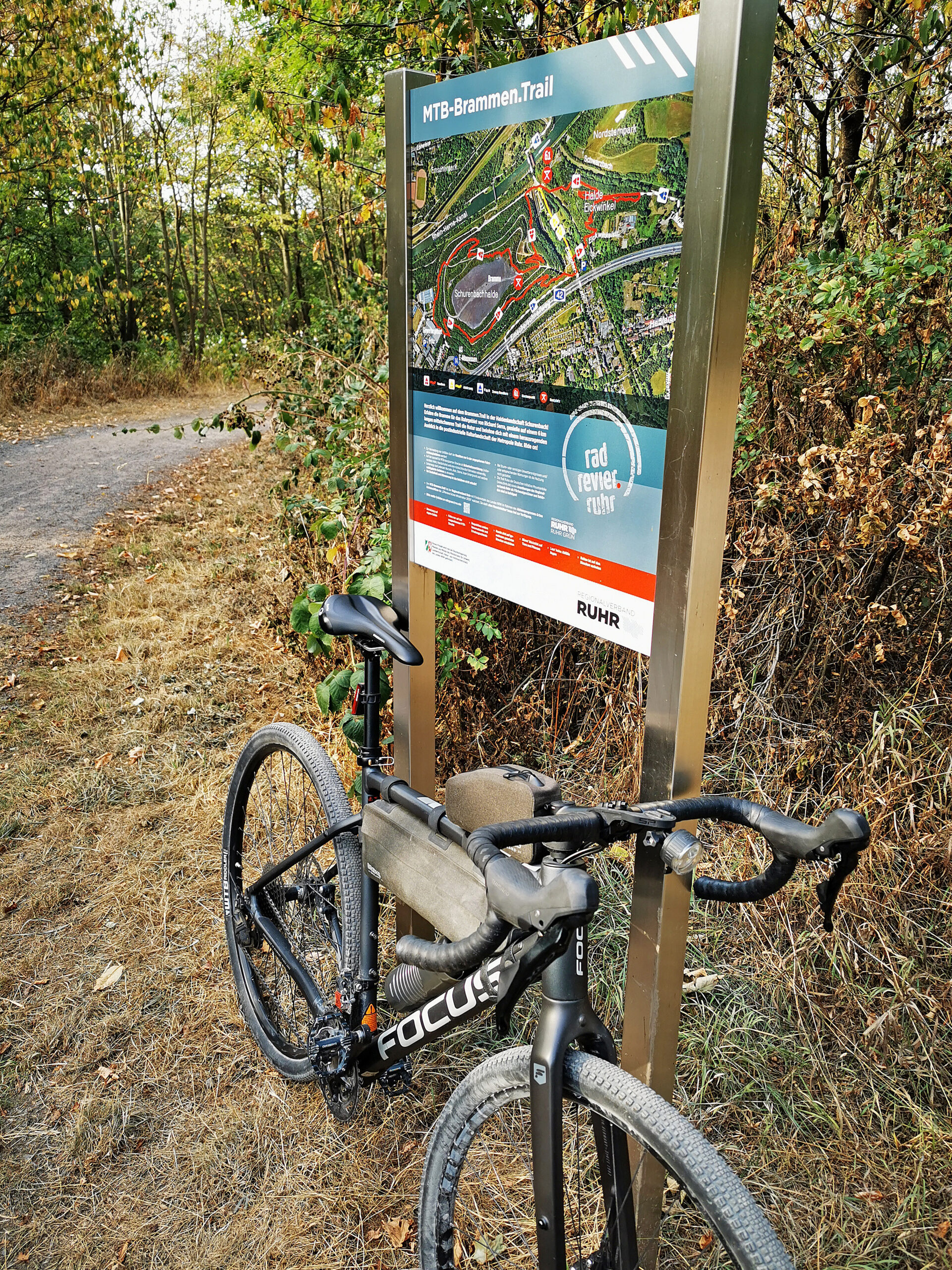 Vor mir liegt das anspruchsvollste Wegestück. Der Brammen.Trail ist eigentlich als Mountainbikestrecke konzipiert und macht sicherlich auch mit breitem Lenker viel mehr Spaß. Dennoch nehme ich den Trail auch mit dem Gravelflitzer gerne unter die Stollen, denn er macht auch mit schmaleren Pneus ordentlich Spaß. Nur bei den Abfahrten sollte man ein wenig vorsichtiger fahren als mit den breiten Schlappen. Und die letzte, etwas steilere Abfahrt an der Halde Eickwinkel muss man sich vielleicht auch nicht unbedingt mit dem Gravelbike geben.