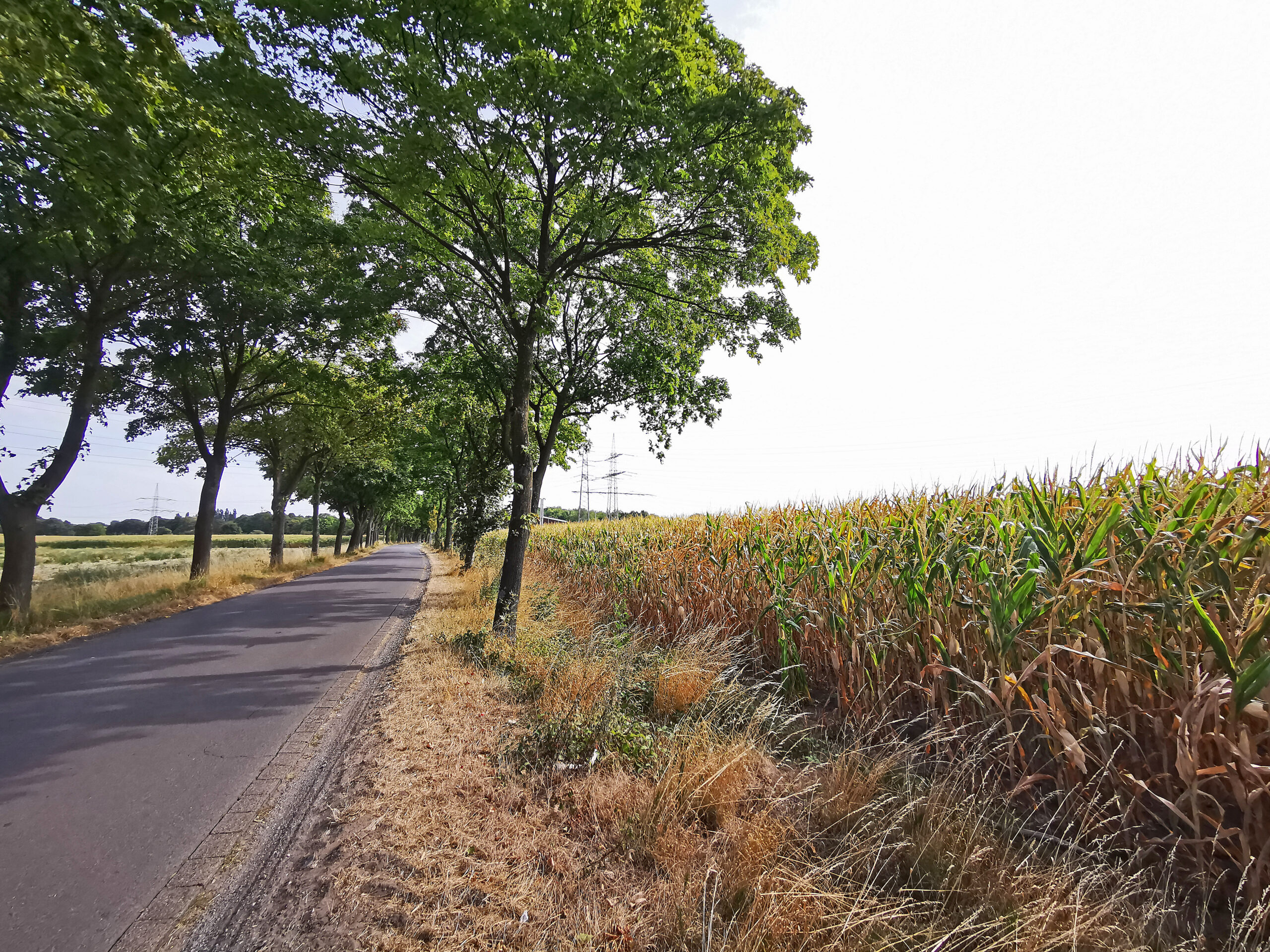 Nach der Abfahrt folge ich einem Uferweg, später geht es über etwas versteckte Schleichwege nahe an der A 2 vorbei und dann ein leider etwas längeres Stückchen auf einer Straße, die aber meistens nicht so stark befahren ist. Auch hier fallen wieder die leider völlig vertrockneten Felder links und rechts am Wegesrand auf. Noch ein bisschen durch eine Siedlung, dann erreiche ich die letzte Halde auf meiner Tour.