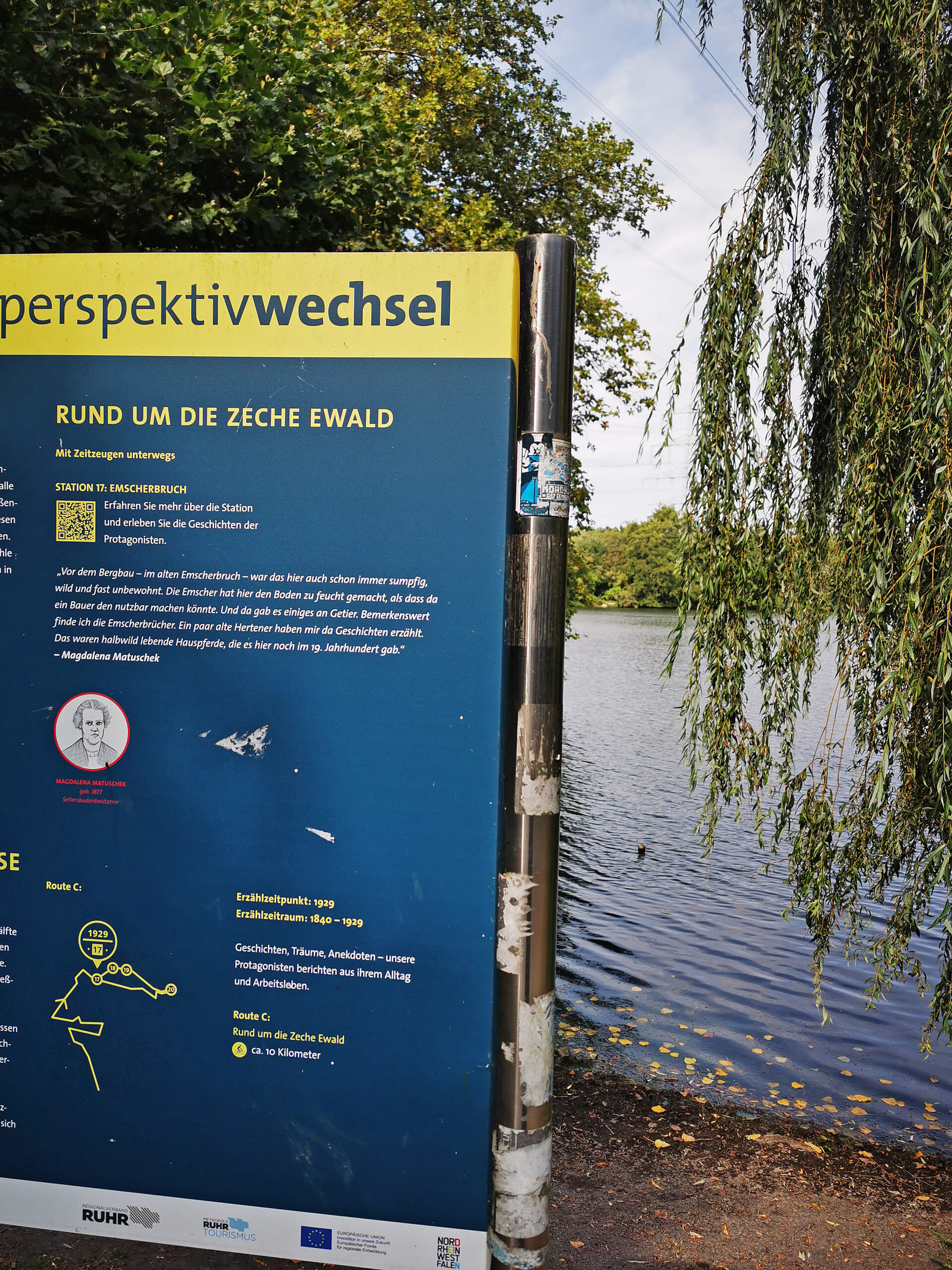 Die Natur nimmt immer mehr zu und irgendwann radel ich mitten im Wald. Frische Luft – einfach herrlich! Ich bin im Naturschutzgebiet Emscherbruch und weiß, dass der Weg zur Zeche Ewald nicht mehr weit ist. Entspanntes Ausradeln ist also angesagt. Der schön gelegene Ewaldsee passt da bestens für ein letztes Päusken ins Bild, dann erreiche ich den Ausgangspunkt an der Zeche Ewald.