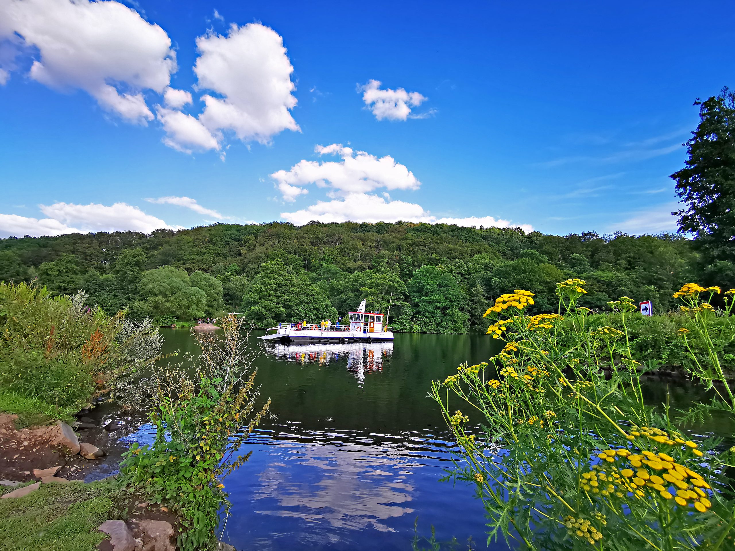 Ich folge dem Ruhrtalradweg also in Richtung Witten, Wetter und Dortmund. Bereits wenige hundert Meter nachdem ich den Radweg am Kemnader See verlassen habe, erreiche ich ein erstes Highlight. Direkt am Leinpfad gelegen verbindet die „ruhrtalFähre Hardenstein“ die Schleuse Witten Herbede mit der Burgruine Hardenstein. In den Monaten April bis Oktober fährt sie zwischen 10 und 18 Uhr. Das Besondere dabei: die Fährleute tun dies ehrenamtlich und würden sich daher sicher über eine kleine Spende freuen.