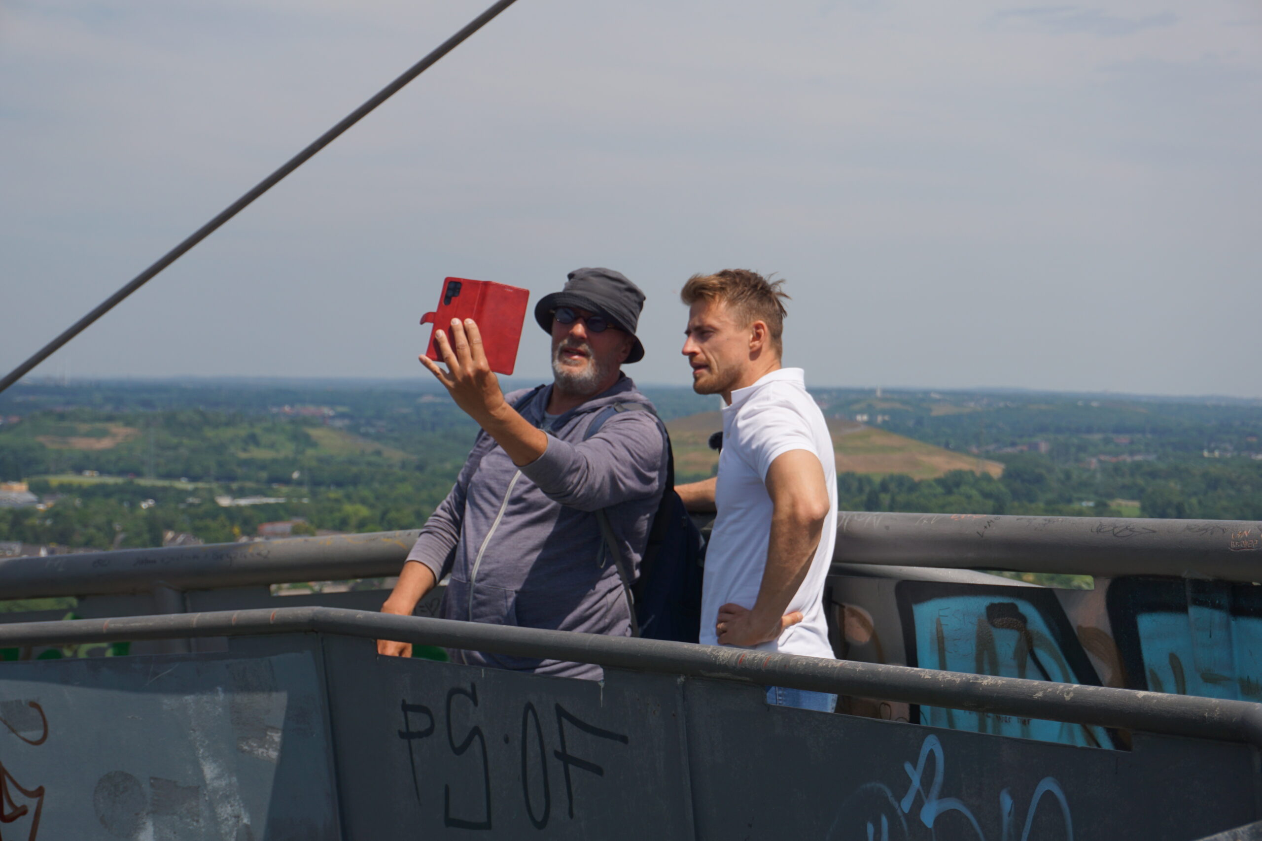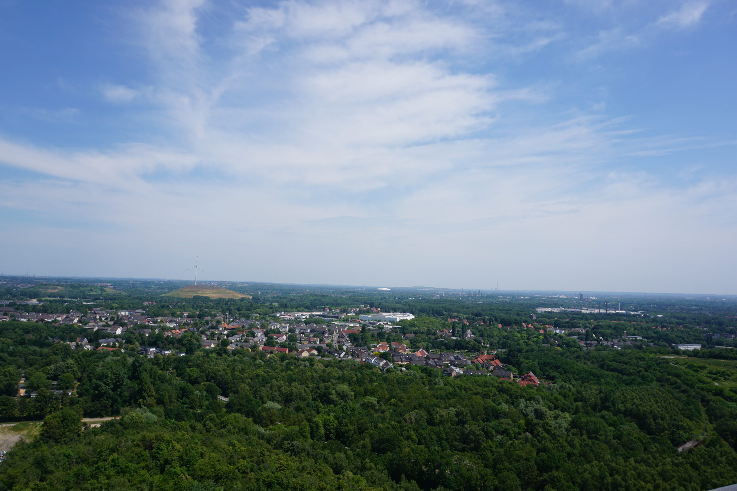 Ohne E-Antrieb dann doch recht beschwerliche 65m geht es die Halde Beckstraße bei brennender Sonne hoch, bis oben endlich der Tetraeder ins Blickfeld gelangt. Der Aufstieg auf selbigen ist dann nochmal kräftezehrend, aber oben angekommen wirst Du mit einem grandiosen Ausblick über den gesamten Pott belohnt! Ist schon echt der Hammer, immer wieder, welches Panorama sich hier bietet. Klar, dass die beiden Radler sich an diesem Ausblick fast gar nicht sattsehen können!