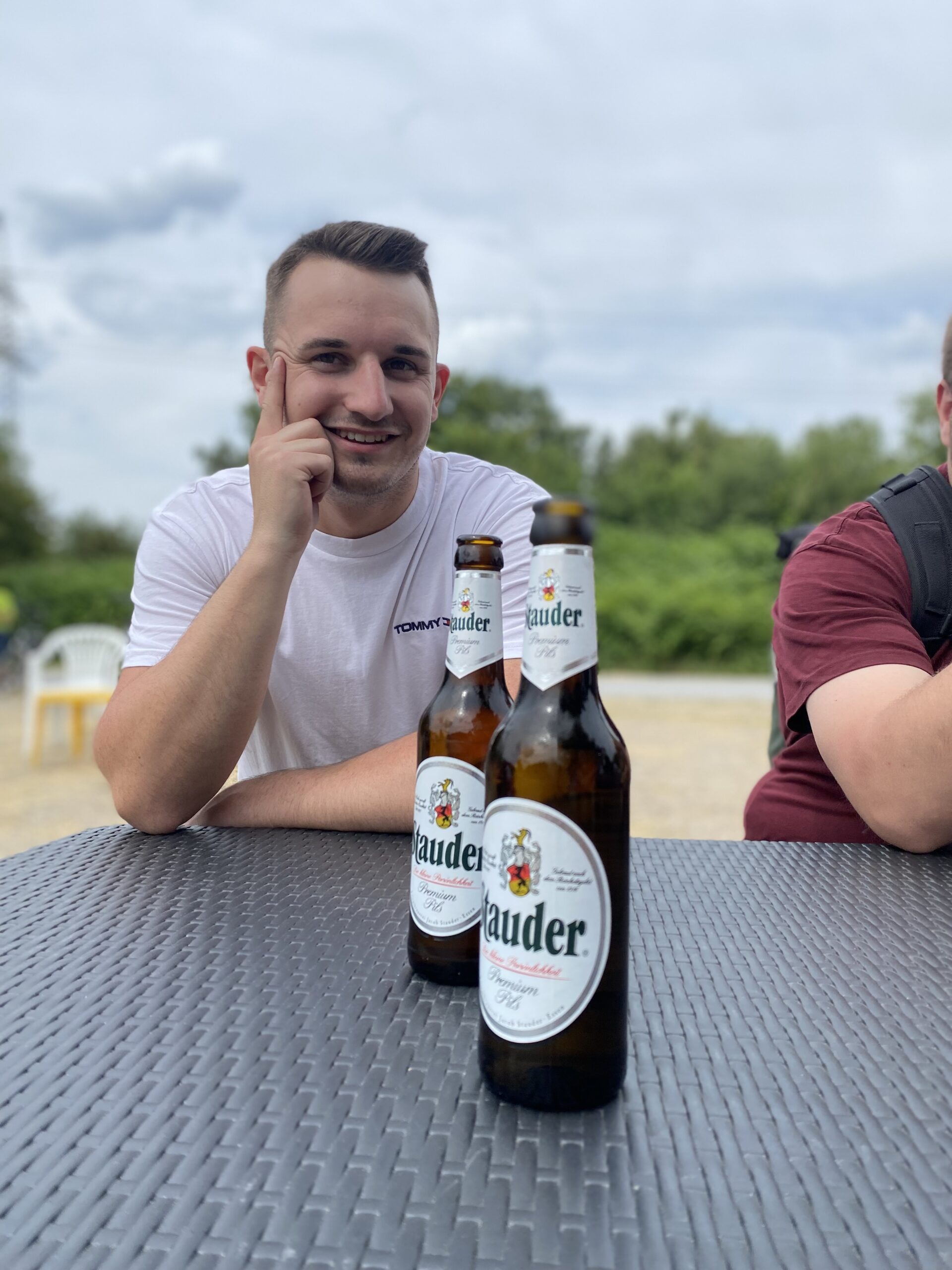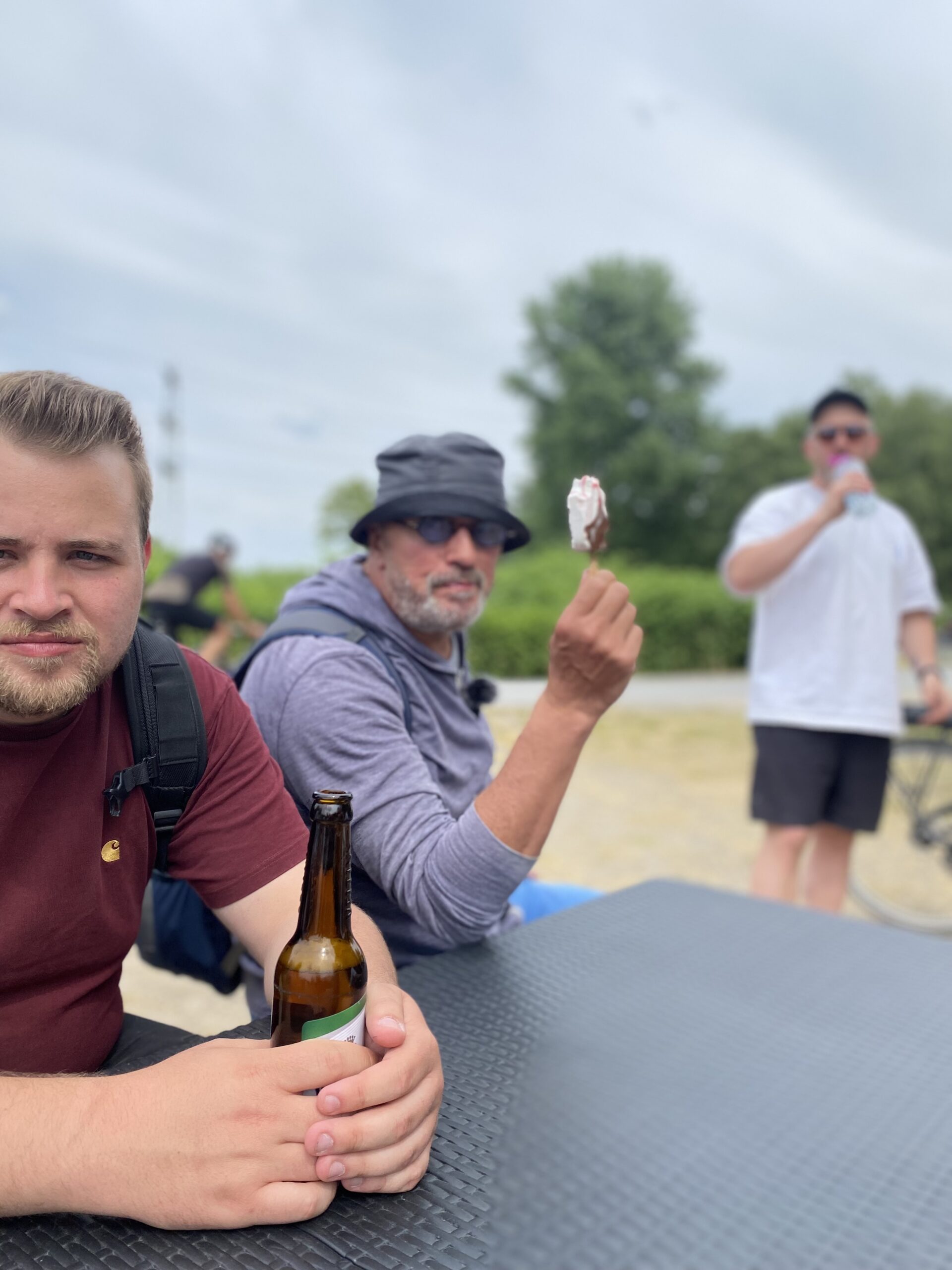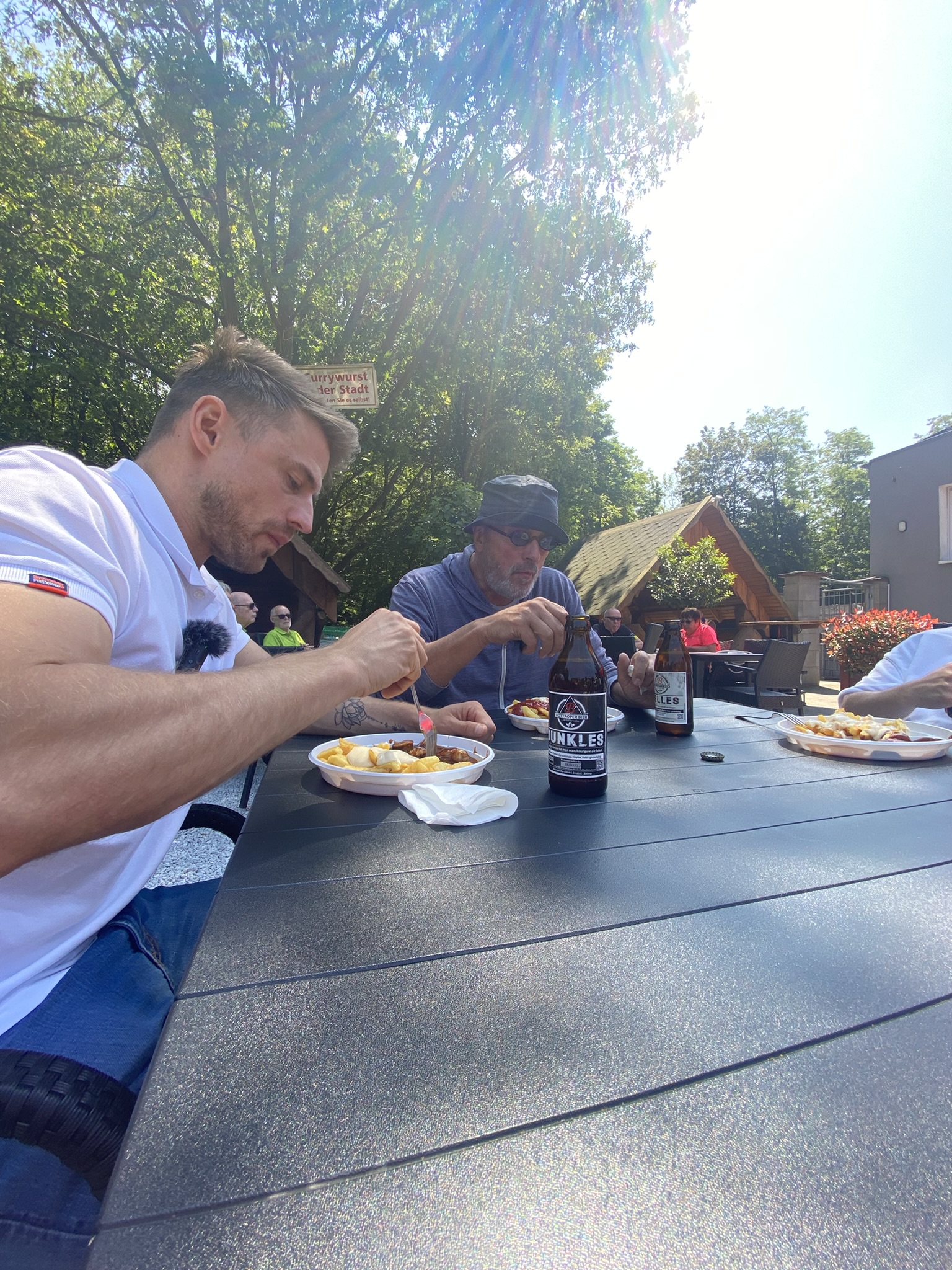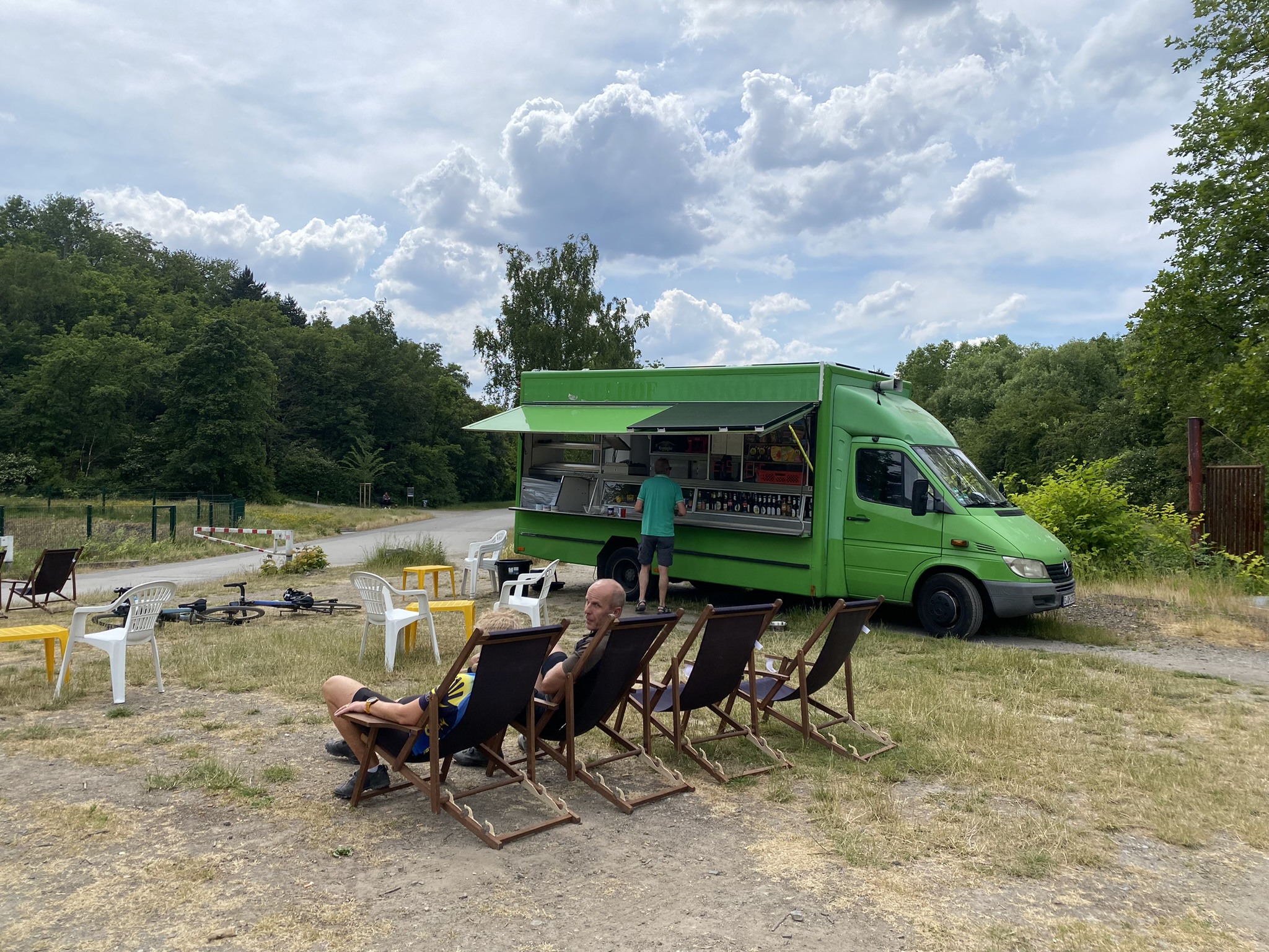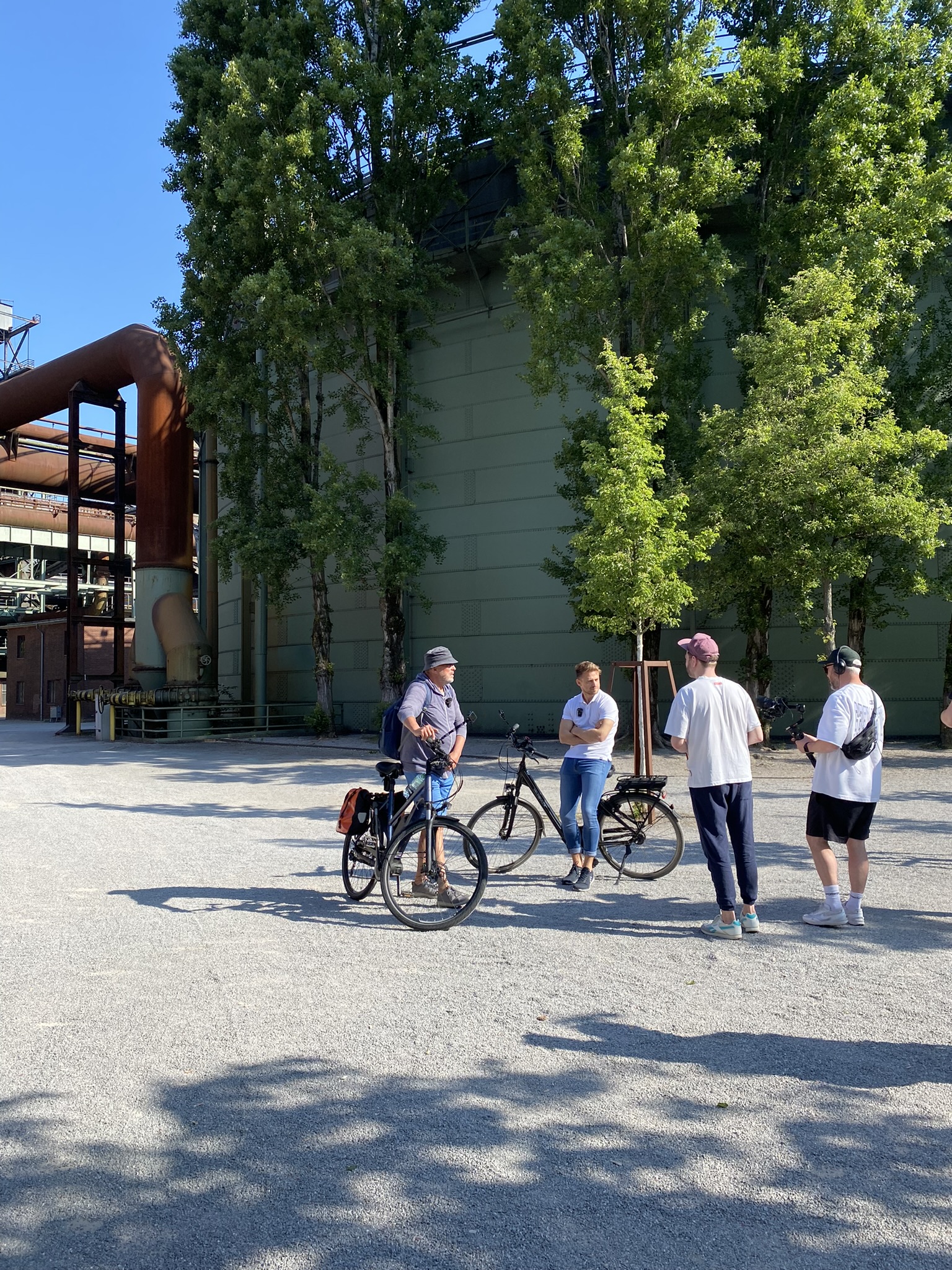 Nach längerer Pause geht es ab hier – leider über einen etwas unschönen Streckenabschnitt bis zum nächsten Stopp unterhalb der Schurenbachhalde und nicht, ohne vorher einen Blick in Richtung Nordsternpark in Gelsenkirchen geworfen zu haben – einem Zufallstreffer unweit des Kanals. Ungeplant, aber aufgrund der warmen Temperaturen umso passender, halten wir am Trassen-Treff Kiosk und lassen uns ein kühles Blondes schmecken. Herrlich lauschig sitzen wir hier und hören Hans-Werner Olm und Cedric Pick beim Fachsimpeln zu. So kann man es aushalten!