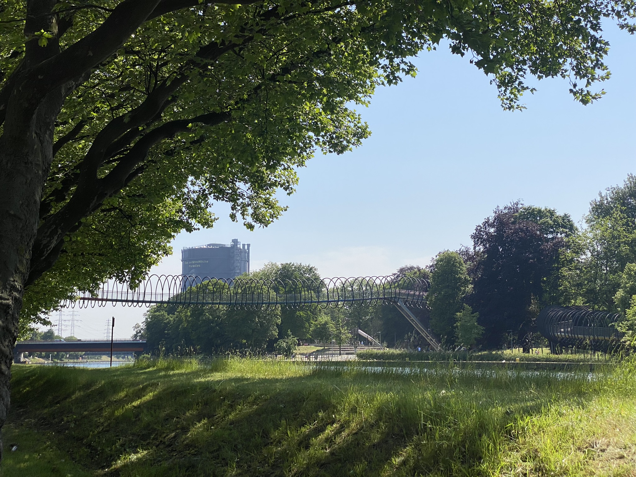 Von hier aus geht es ganz bequem und sehr angenehm am Ufer des Rhein-Herne-Kanals vorbei an der Slinky Brücke und dem Gasometer Richtung Tetraeder.