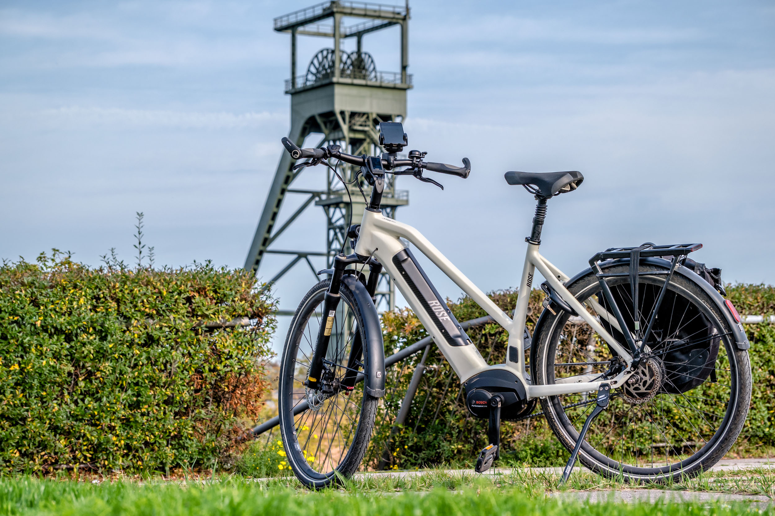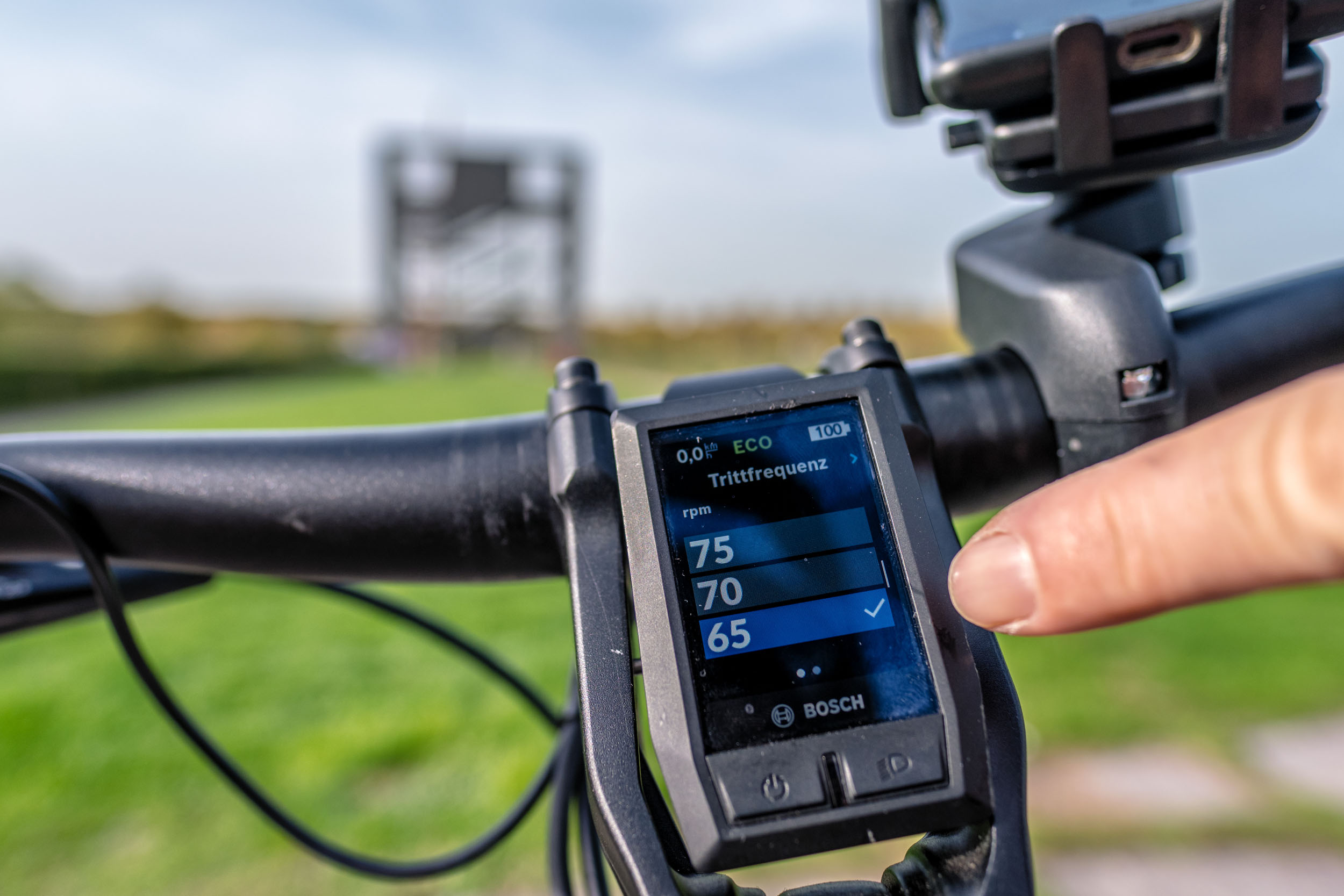 Gerade am Anfang erwische ich mich immer wieder dabei, schalten zu wollen… Aber es gibt halt keinen Schalthebel. Im Menü des Displays stellt man die bevorzugte Trittfrequenz ein, den Rest macht dann das Fahrrad selber. Welche Trittfrequenz du wählst, ist natürlich Geschmacksache. Viele wählen erfahrungsgemäß eine eher zu niedrige Frequenz. Ich fühlte mich in der Ebene mit 65 Umdrehungen am wohlsten und bin dann später bei der Auffahrt auf die Halde auf 70 hochgegangen. Jedoch hängt das auch von der gewählten Unterstützungsstufe ab. Fährst du viel im ECO-Modus, ist eine höhere Drehzahl wirklich hilfreich. Je mehr der Motor unterstützt, desto mehr wird man dazu verleitet, mit niedrigerer Frequenz zu radeln. Aber auch hier trägt eine höhere Trittfrequenz durchaus zu einer optimierten und ressourcenschonenderen Fahrweise bei.