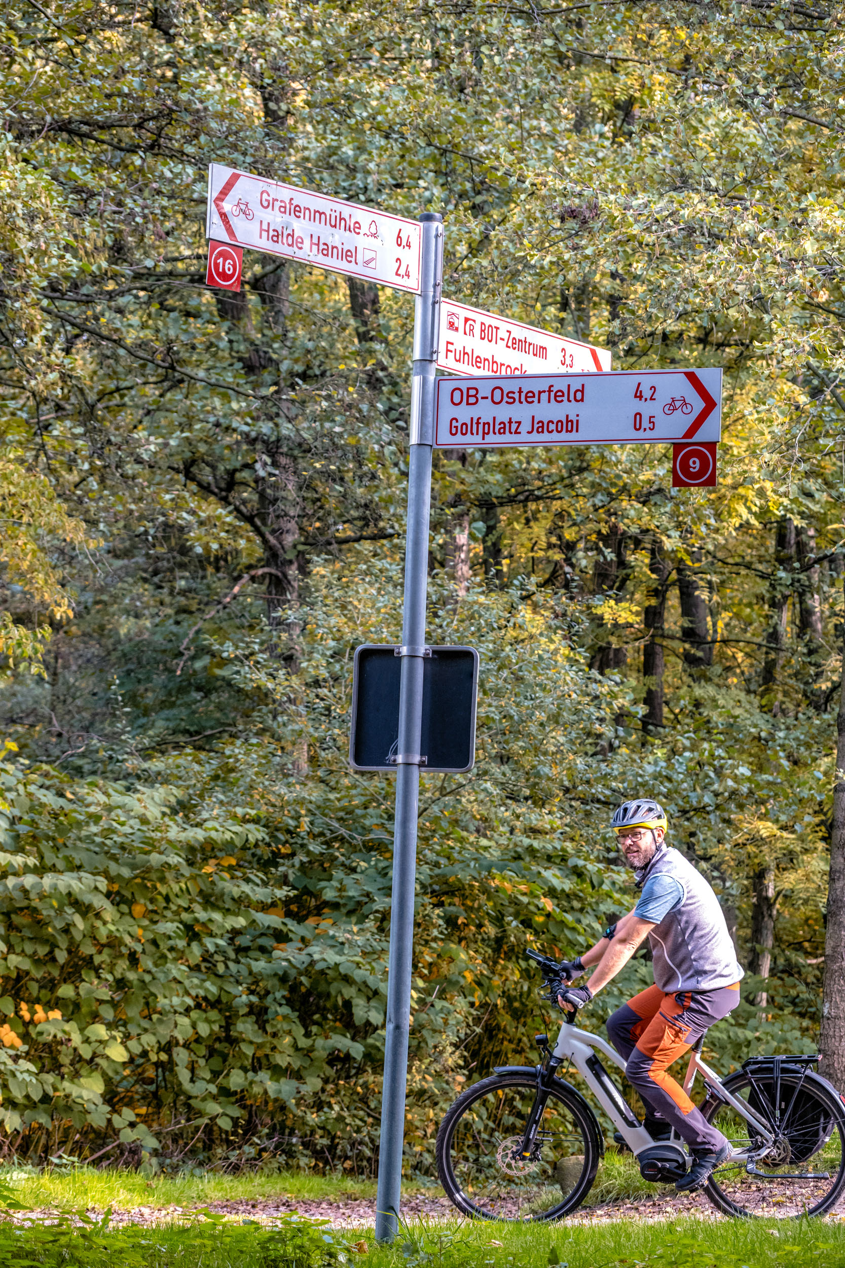 Auf dem Gelände der ehemaligen Zeche Jacobi liegt heute ein Golfplatz, den wir auf recht schmalen Pfaden umfahren, bevor wir wieder den ausgebauten Bahntrassenradweg erreichen. Wir gleiten entspannt durch die Herbstlandschaft und erreichen schließlich den Kreuzweg hoch auf die Halde.