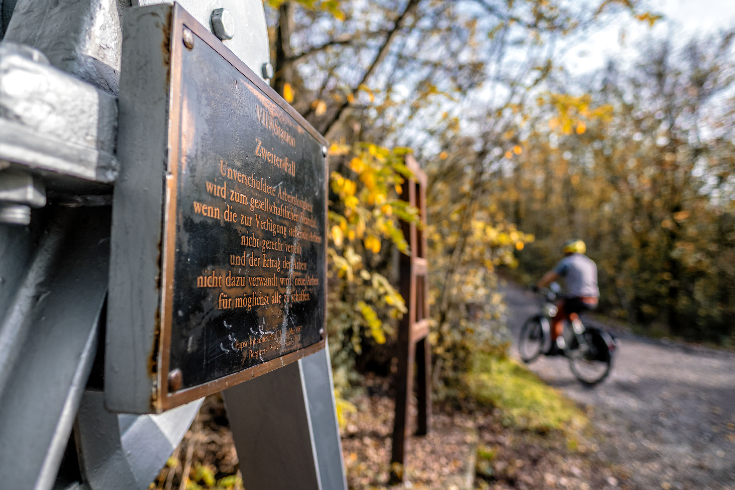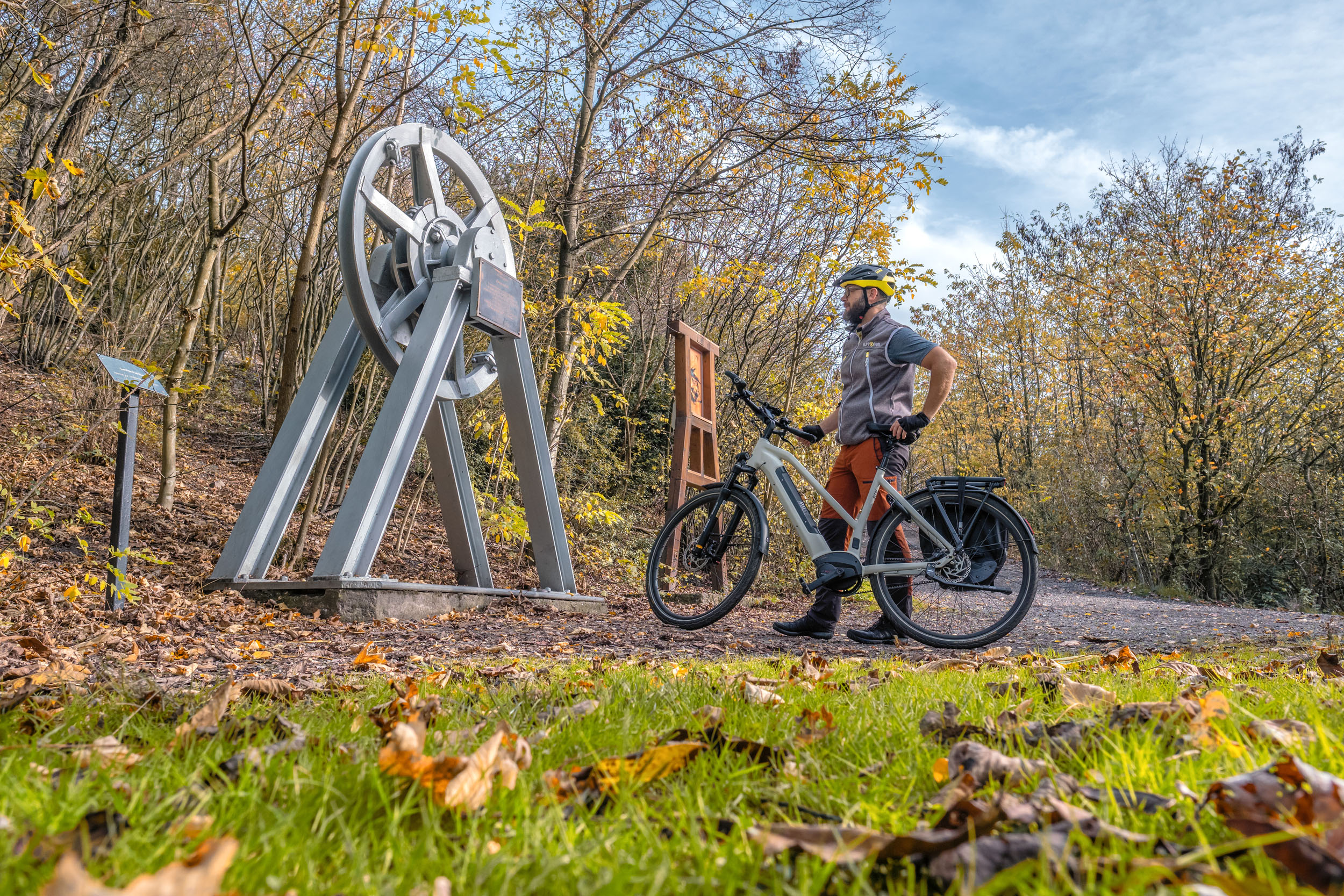 Die Auffahrt über den Kreuzweg fällt mit dem E-Bike besonders entspannt aus. Unten an der Infotafel drehe ich die Trittfrequenz auf 70 hoch, den Rest erledigt dann der Bosch Motor und die Automatik. Wer lieber sportlich fährt, für den ist das XTRA Watt Allroad die dynamischere Alternative. Wer aber gerne entspannt die tolle Landschaft erleben möchte, wird das XTRA WATT EVO lieben. Ich muss mir keine Gedanken ums Runterschalten vor den Kurven machen sondern genieße das Herbstlicht und die am Wegesrand immer wieder auftauchenden Relikte des Bergbaus. Auch wenn ich am Hang kurz stehen bleibe, fällt das Anfahren mit der Automatikschaltung besonders leicht.