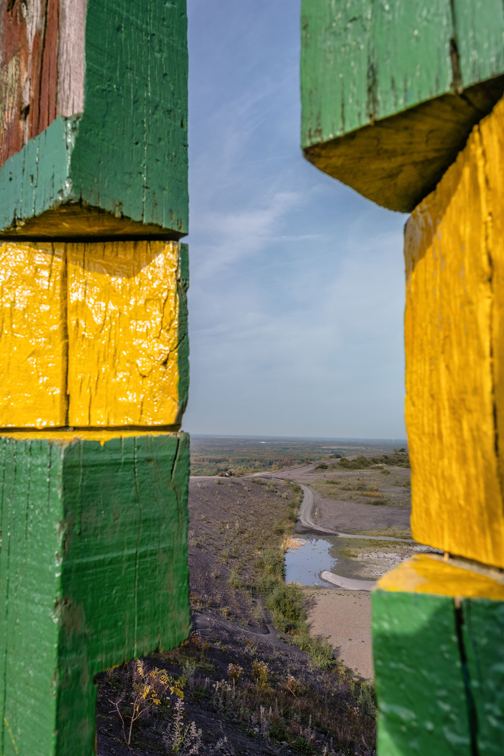 Noch ein paar Höhenmeter, dann erreichen wir das Haldentop mit den bekannten und beliebten Eisenbahnschwellen, die als bunt bemalte Totems wunderbar in der tiefen Herbstsonne leuchten – genau der richtige Ort für ein erstes entspanntes Päusken.