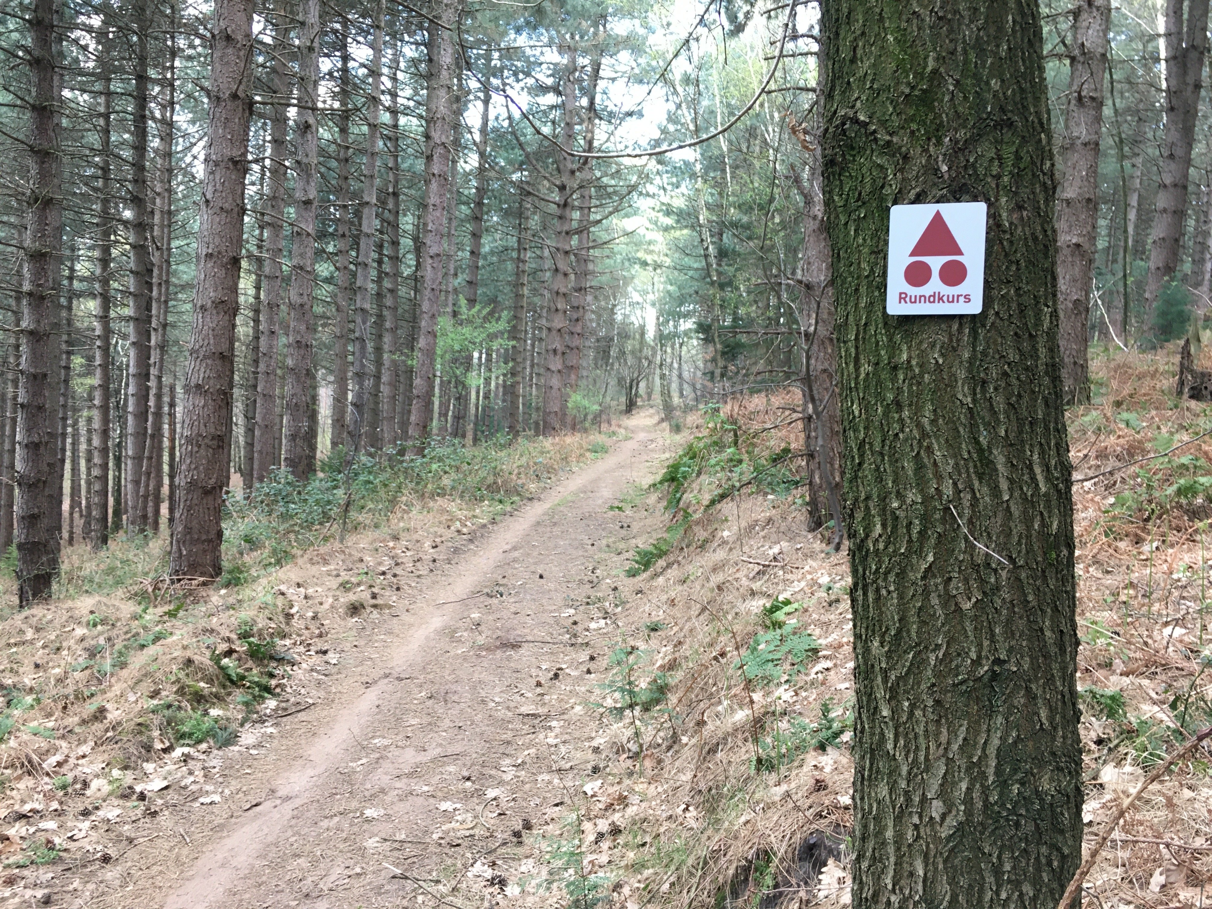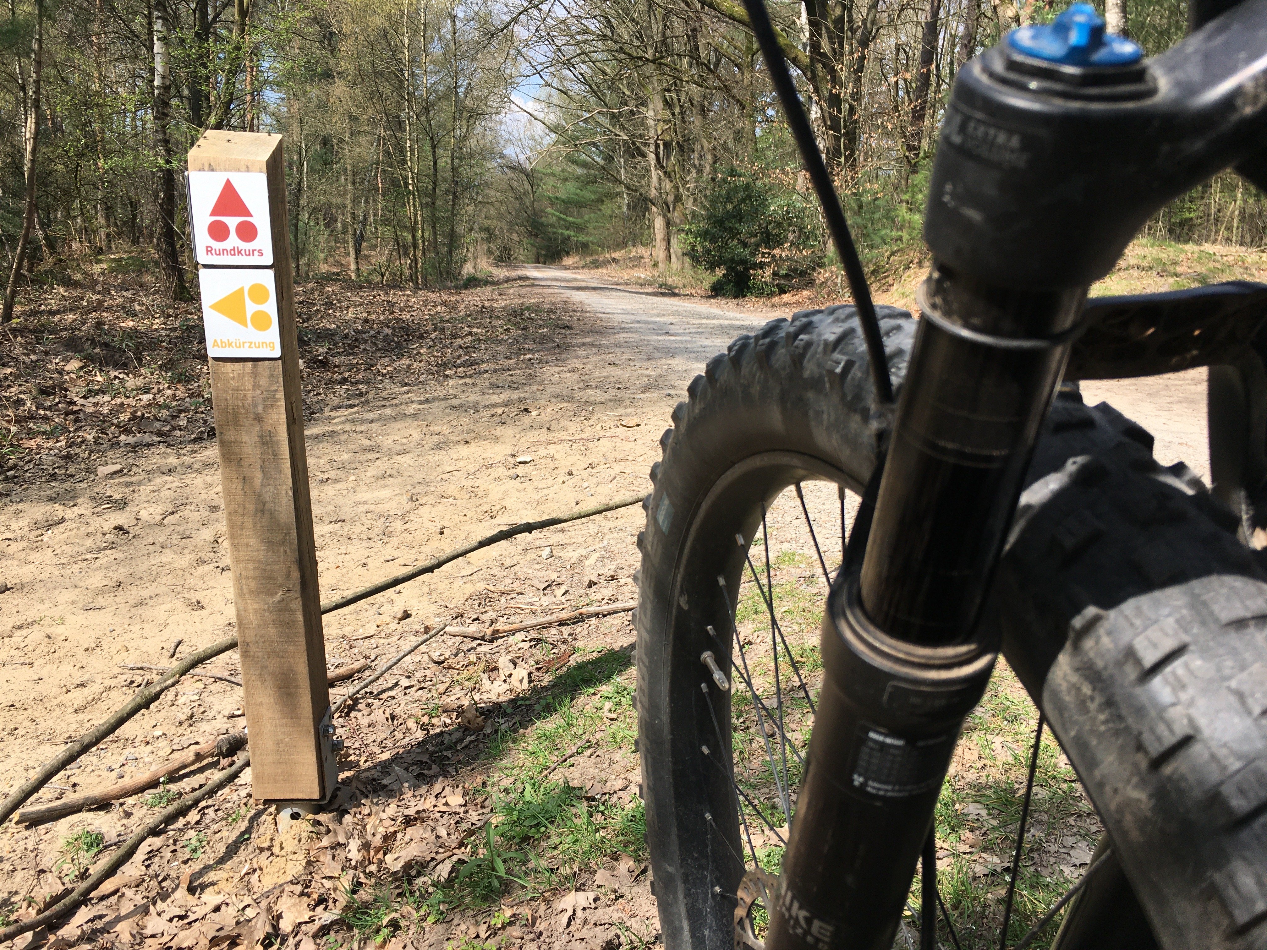 Kurze Zeit später erreichen wir den Parkplatz an der Brinkfortsheide und sehen sofort das erste blaue Schild, das uns den Weg zur Haard on Tour weist. Nach ca. 2,5 km können wir kaum glauben, dass wir gerade noch im Herzen des Ruhrgebiets waren. Ein dichter Wald, sandiger Boden, keine Autos, irgendwie idyllisch. Am Wegesrand entdecken wir gleich schon das nächste Schild. Diesmal ein Rotes. Die blauen Schilder weisen den Weg vom Parkplatz in die Haard hinein, die roten Schilder markieren die Mountainbikestrecke selbst.