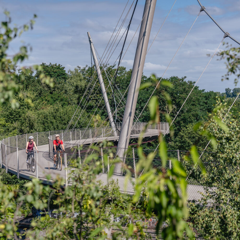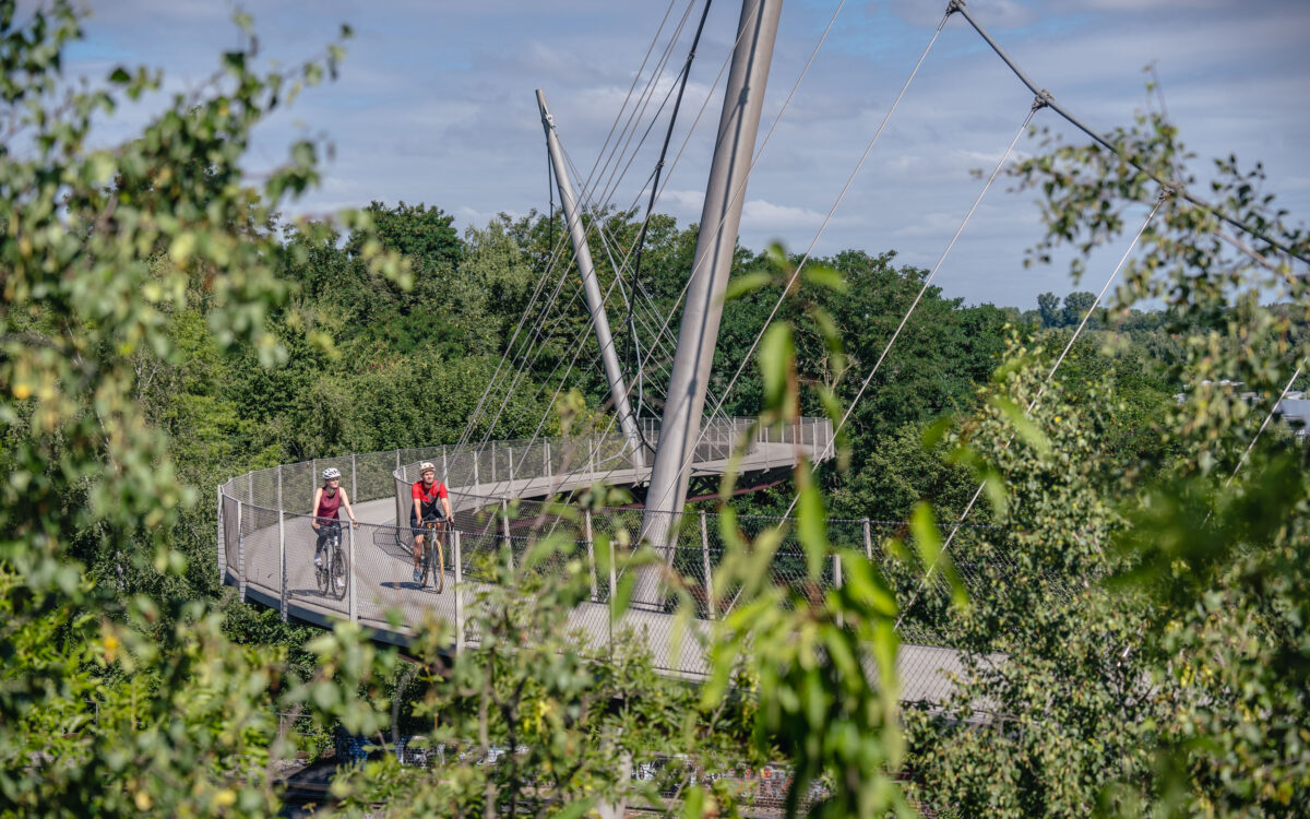 De Erzbahntrasse is één van de bekendste spoorlijnen in het Ruhrgebied en brengt u over een afstand van ongeveer tien kilometer van Bochum naar Gelsenkirchen. Westpark aan de Jahrhunderthalle De tocht start in Bochum met de opvallende, 130 meter lange Erzbahnschwinge (Ertsspoorschommel). Van daaruit fietst u over de goed aangelegde route, steeds licht bergafwaarts, naar de spectaculaire Grimberger Sichel, die met een overspanning van 150 meter de brug vormt over de Rijn-Herne-kanaal maakt.