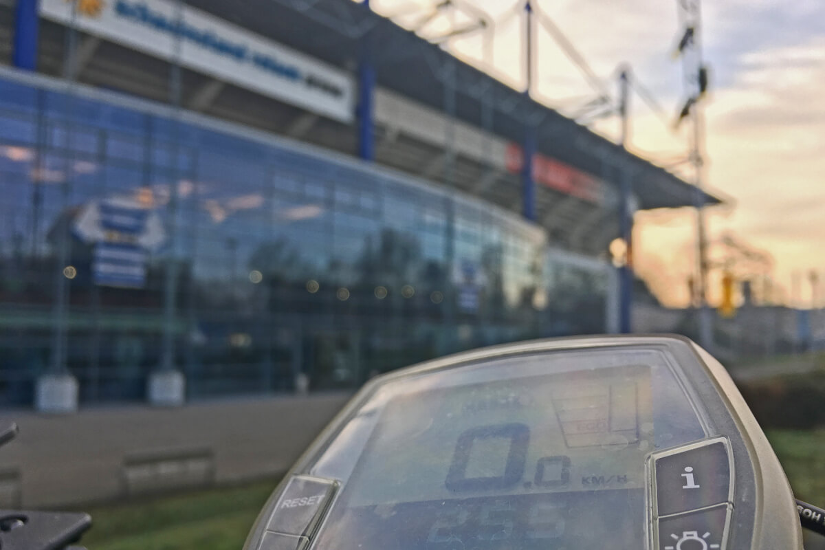 Es ist 7 Uhr morgens und ich stehe völlig übermüdet vor der Schauinsland Arena in Duisburg. Zur Müdigkeit gesellt sich eine gewaltige Unsicherheit, ob ich mir da nicht zu viel vorgenommen habe. Meine Komoot-App zeigt 190 Kilometer auf der ToDo-Anzeige an, also etwas weniger als ursprünglich erwartet. Dafür stehen aber auch rund 850 Höhenmeter auf dem Programm. Ich muss gestehen, so früh in der Saison war ich mir selber nicht sicher, ob ich das schaffe und habe daher ein E-Bike für heute gewählt. Mit 1000 Wh Akkuleistung an Bord zeigt das Display 255 Kilometer Reichweite im Eco-Modus an – das könnte am Ende knapp werden.