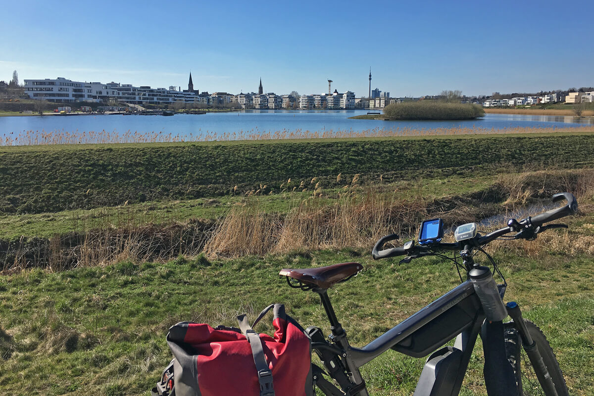 Ich packe mein Fahrrad und radel los, erstmal ganz ohne Unterstützung etwas Strom sparen. 10 Kilometer habe ich mir so vorgenommen. Es geht vorbei an der Wasserwelt Wedau, ein entspannter Einstieg morgens um diese Uhrzeit. Schnell sind die ersten 10 Kilometer erreicht und ich entscheide mich, weitere 10 Kilometer ohne Unterstützung zu fahren. Nach etwas Stadtverkehr und dem schönen Ortskern von Mülheim-Saarn bin ich endlich an der Ruhr. Über den ehemaligen Treidelpfad geht es bis nach Kettwig, hier gönne ich mir ein zweites Frühstück.