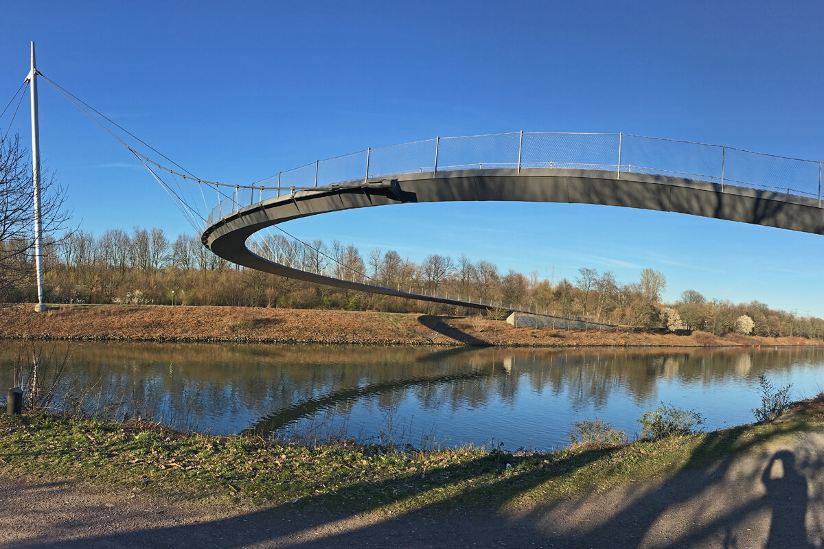 Die Zeche Zollern ist das nächste große Highlight am Wegesrand. Natürlich bleibt nur ein kurzer Blick auf das „Schloss der Arbeit“, dennoch finde ich es toll, dass so viele Industriedenkmäler direkt an der Strecke liegen. In Bochum überrascht mich die richtig schöne Strecke entlang des Grummer Bachs, die ich bisher noch gar nicht kannte. Ein kleiner Junge auf einem Kinderrad fragt mich, wo ich hinfahre. Bei der Antwort Duisburg ernte ich einen erstaunten Blick – genau die richtige Motivation für das letzte Drittel. Denn ich merke nun, dass die Muskeln müde werden und die Gelenke eigentlich nach Feierabend schreien. Bergauf schalte ich nun gerne mal auf den Tourmodus hoch.