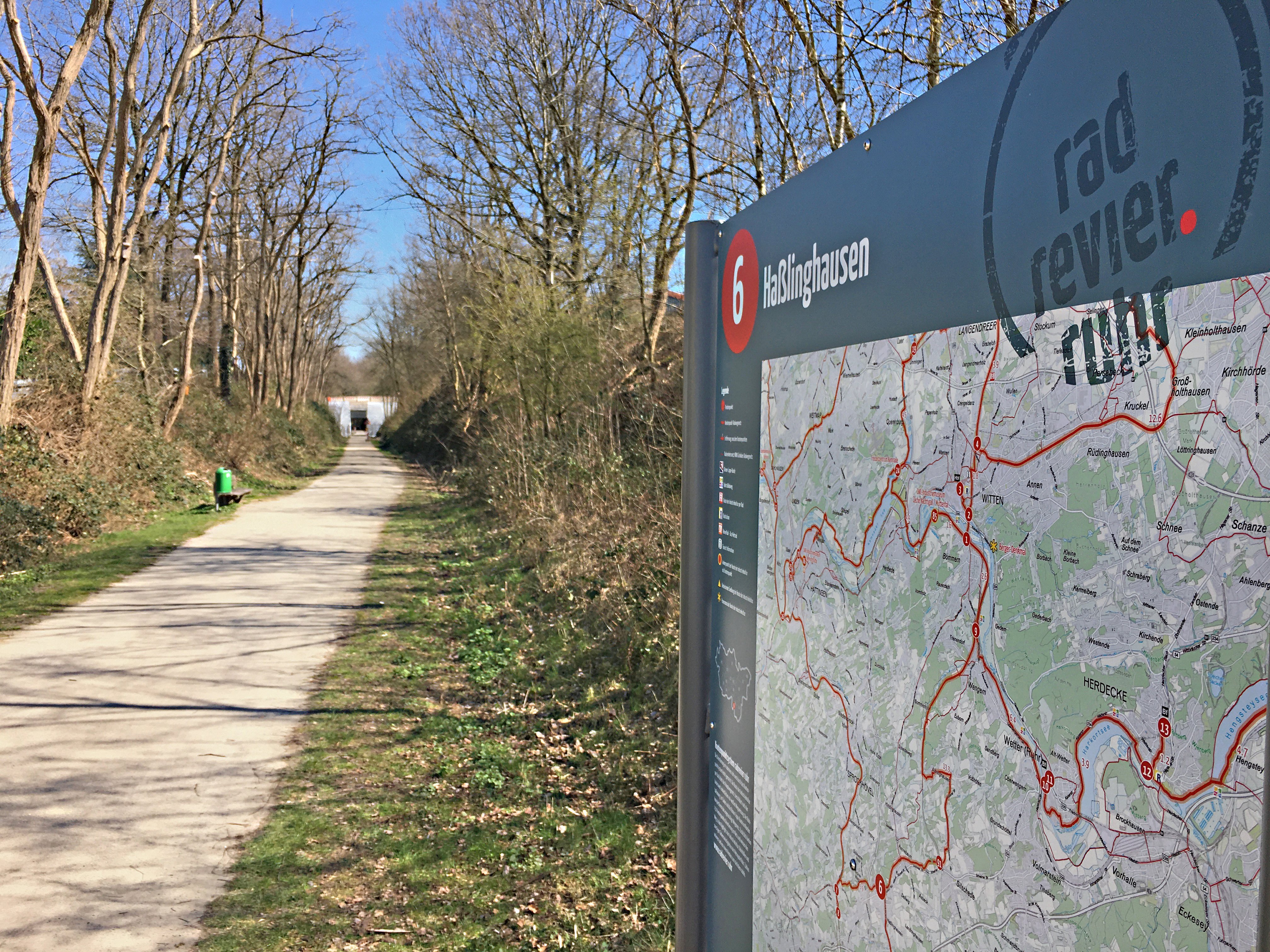 Die Anreise kann direkt zum Hauptbahnhof Hagen erfolgen. Hier startet meine Tour, die ich vor 2,5 Monaten im März gefahren bin (daher die etwas wenigen Blätter auf den Bäumen), am Knotenpunkt 69. Die 68 liegt fast unmittelbar daneben, ab hier bin ich auf dem Rundkurs. Ich fahre im Uhrzeigersinn zunächst flussaufwärts im Tal der Ennepe. Der Stadtverkehr innerhalb Hagens ist nicht ganz so toll. Als erfahrener Radler komme ich schon zügig vorwärts, unerfahrenere Radfahrer werden sich aber sicherlich an einigen Stellen etwas schwer tun.