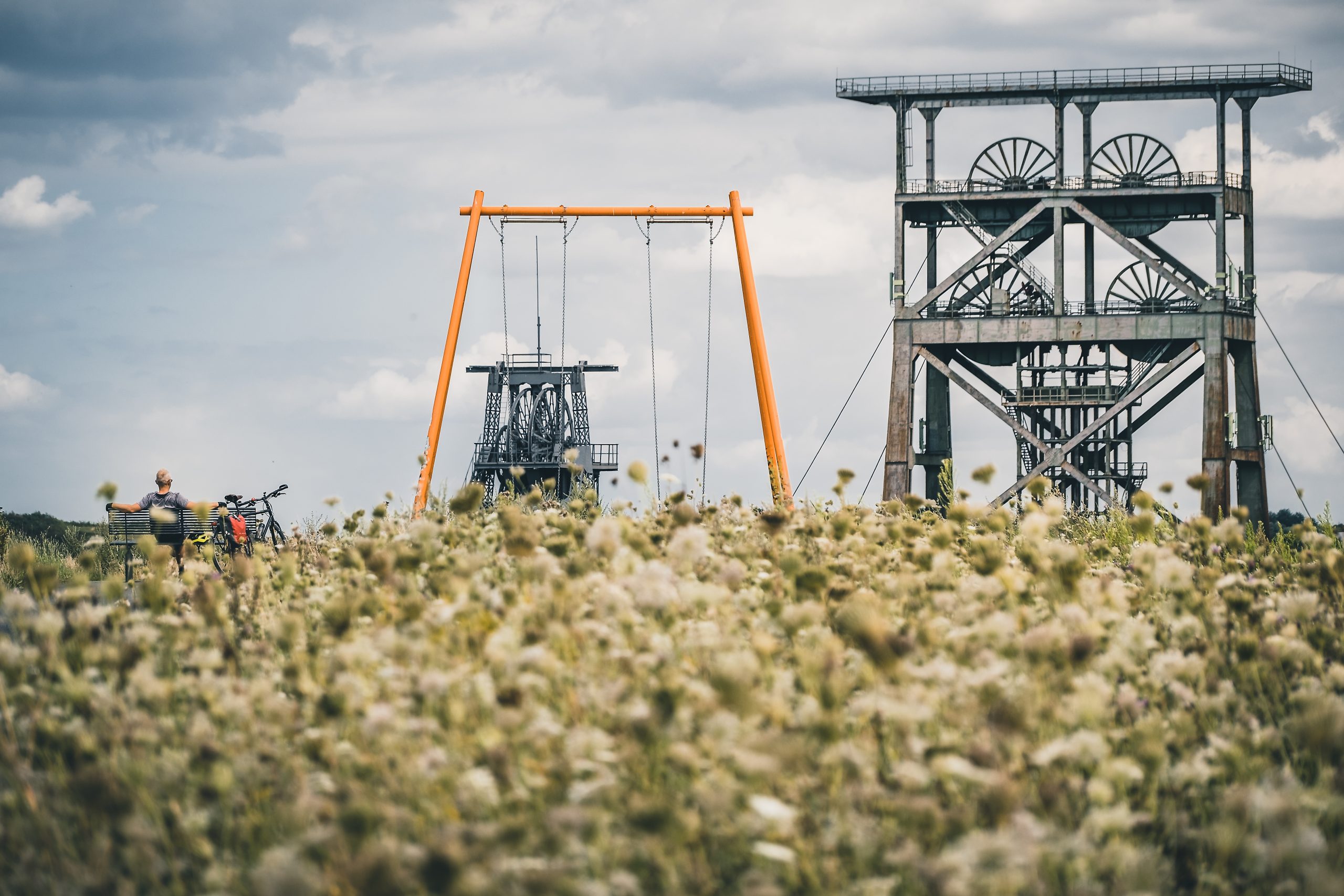 Wir radeln weiter auf dem Emscher-Weg und gelangen schnell zum nächsten Highlight der Tour – hier sogar im wahrsten Sinne des Wortes. Denn es geht hoch, richtig hoch. Kurz vor dem Deusenberg schlängeln wir uns links durch einen kleinen Trampelpfad, gelangen wieder zu einem verlassenen Asphaltweg und umrunden die Halde im Uhrzeigersinn, bis ein geschotterter Feldweg berghoch führt. Während die Muskelfasern auf Hochtour arbeiten und die Waden zunehmend anfangen zu glühen, versuchen wir den Blick auf die Kokerei Hansa und leicht hinter uns die Zeche Hansa zu genießen. Ein kurzes Päusken auf halben Weg hilft natürlich dabei.