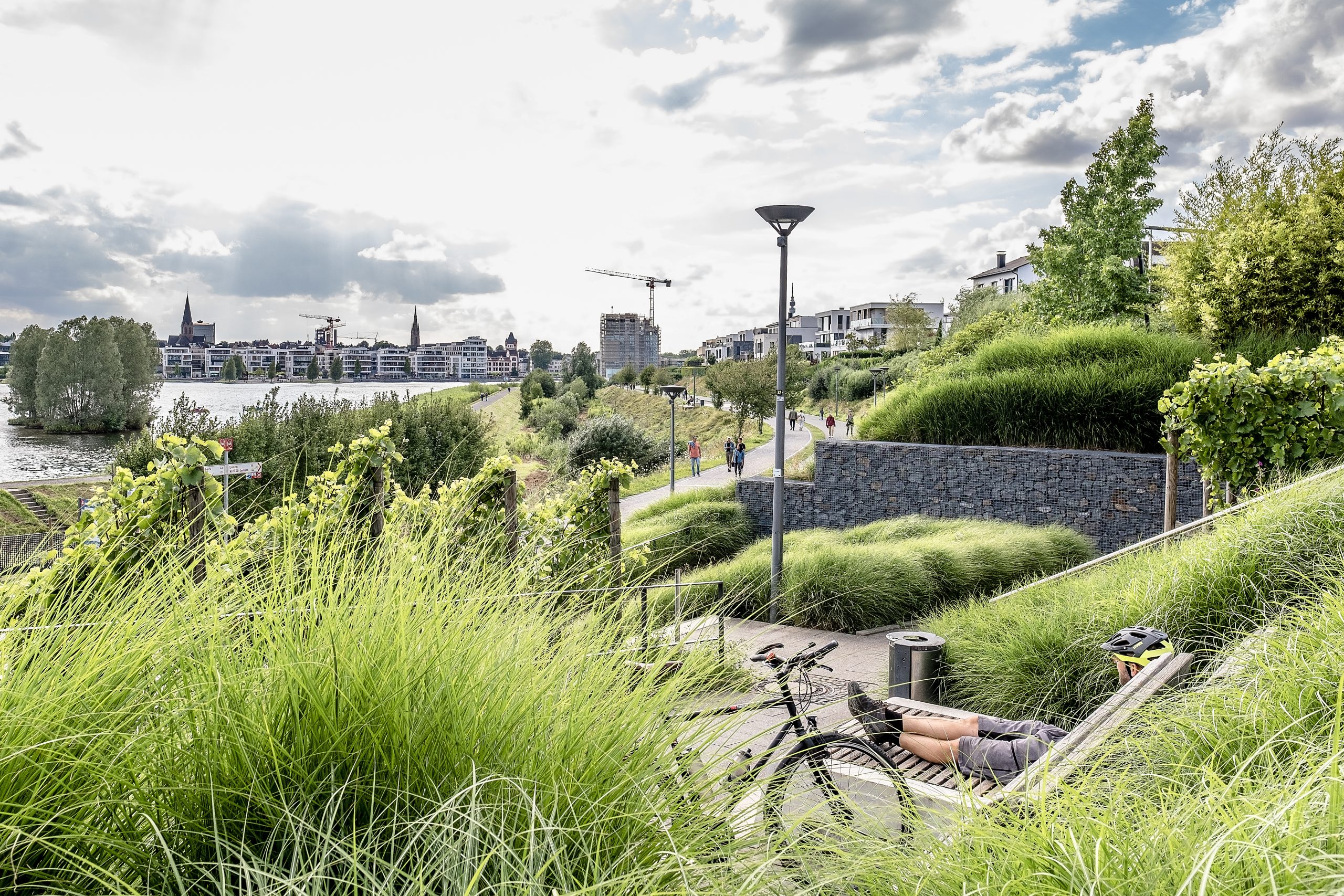 Wir radeln entspannt am See entlang und gelangen zum bereits erwähnten Weinberg. Man kann den Phoenix See mit seinen Luxusvillen durchaus kontrovers diskutieren, aber der Weinberg der Emscher Genossenschaft ist einfach eine wundervolle Idee. Jetzt im Hochsommer hängen schon große Trauben an den Reben, schicke Holzbänke bieten den entspannten Blick durch die Reben hindurch auf den See – Urlaubsfeeling pur.