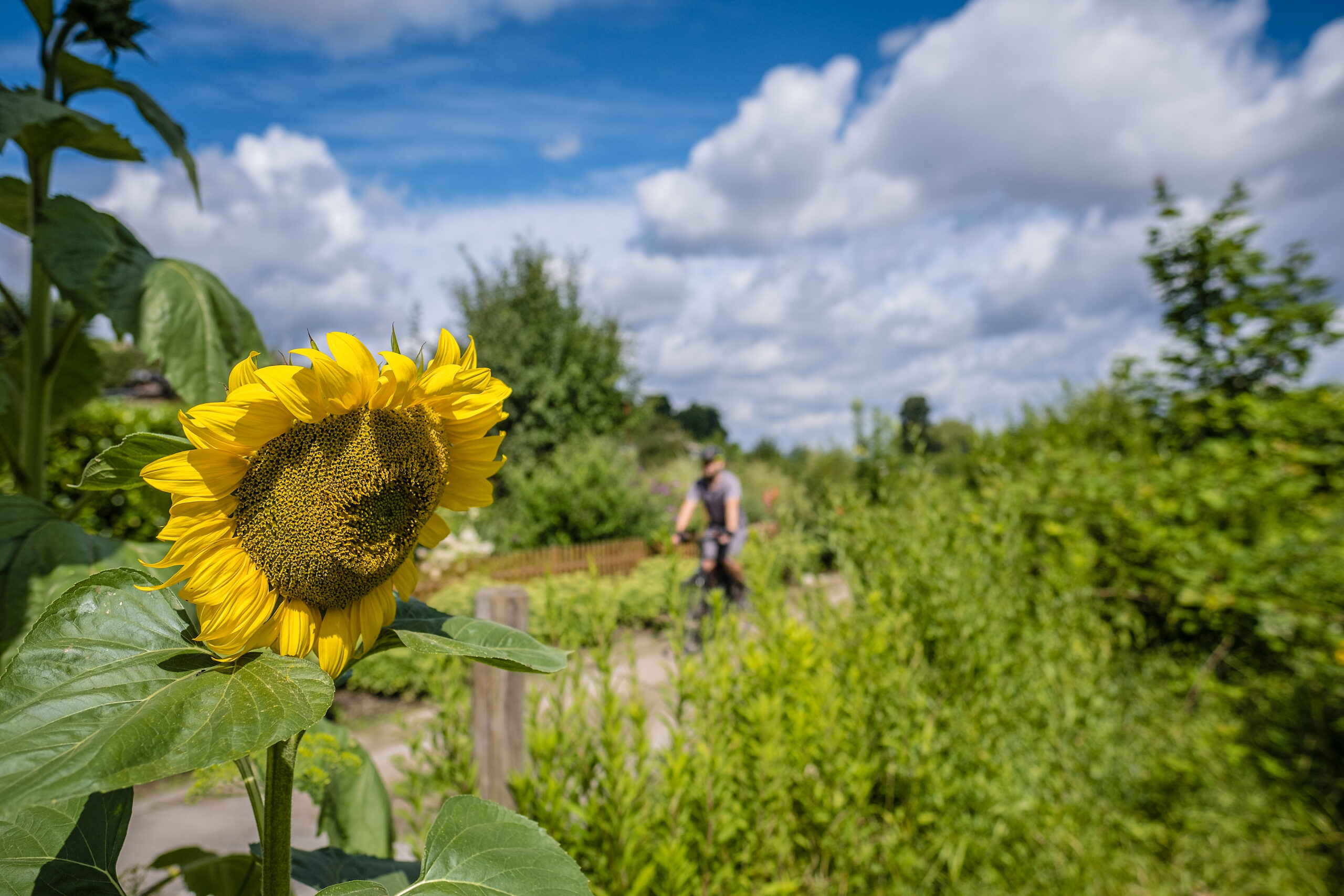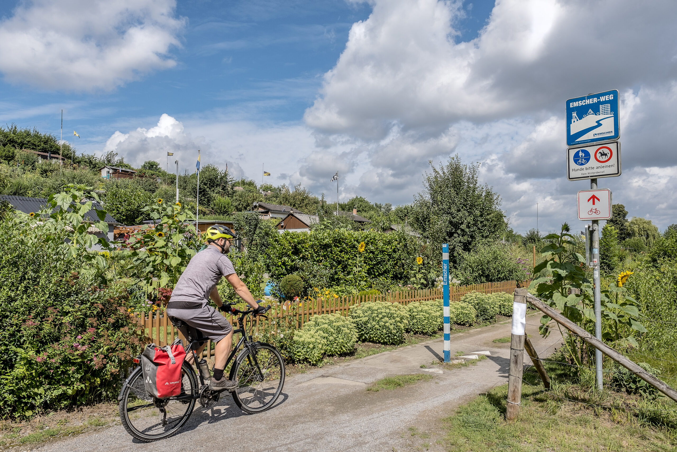 Nach kurzer Abfahrt unter der A 40 rollen wir durch eine schicke Kleingartensiedlung direkt neben der Emscher. Die Sonnenblumen ranken um die Wette und die Kleingartenidylle scheint perfekt.