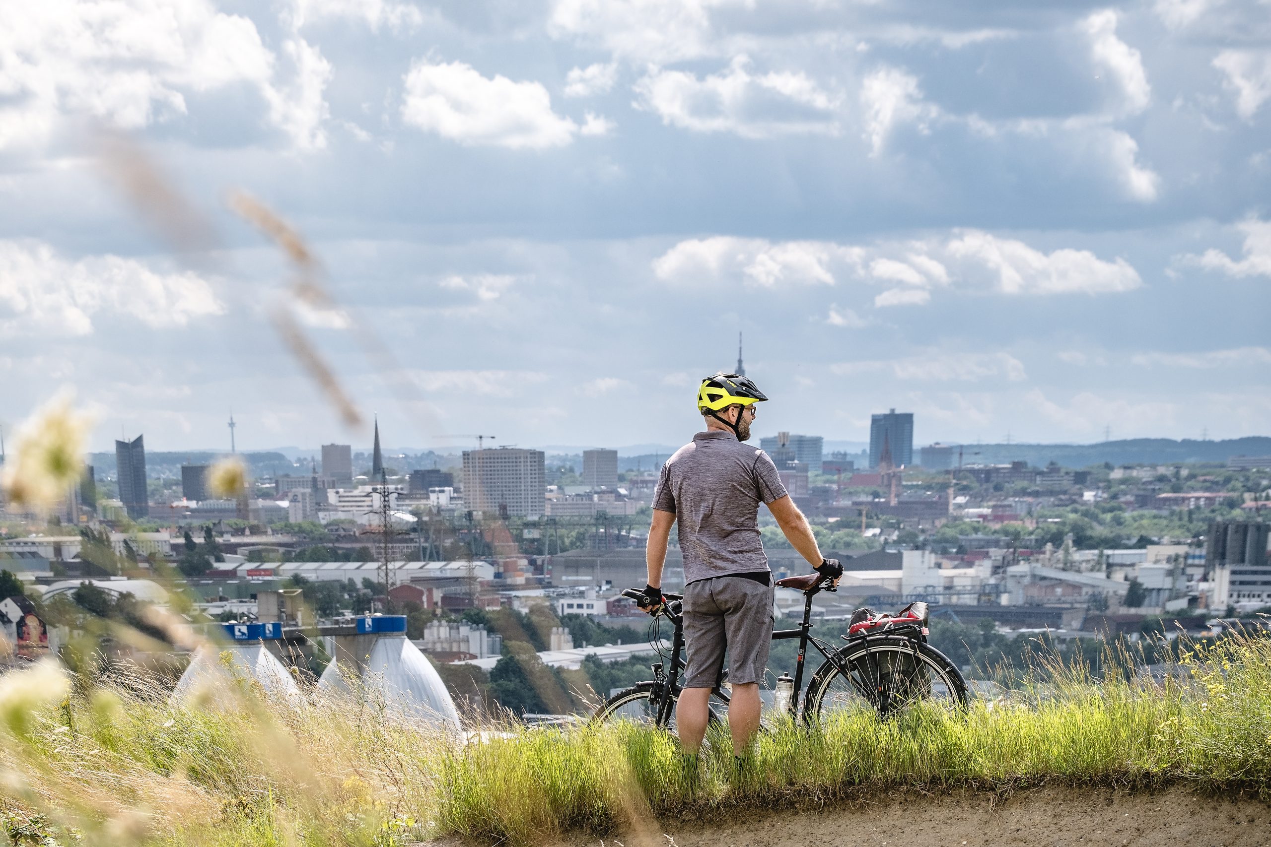 Der Atem wird kräftiger. Ich bin mit meinem „Biobike“ unterwegs und vermisse den Turbo-Knopf meines E-Bikes, während ich weiter aufwärts keuche, bis wir schließlich eine große Anlage von Sonnenkollektoren umfahren und einen wunderbaren Ausblick auf Dortmund genießen können. Für mich ist das hier oben einfach der beste Blick auf die größte Stadt des Ruhrgebiets und jede Schweißperle wert.