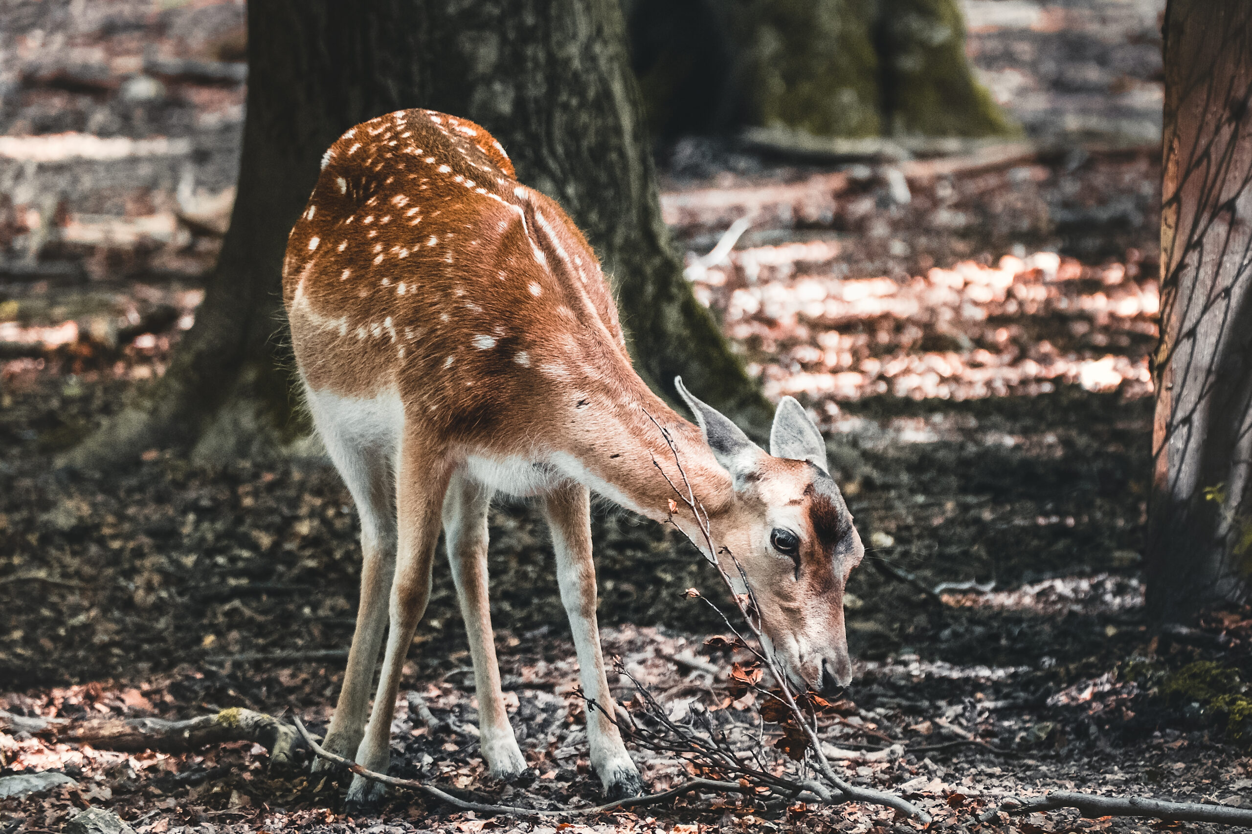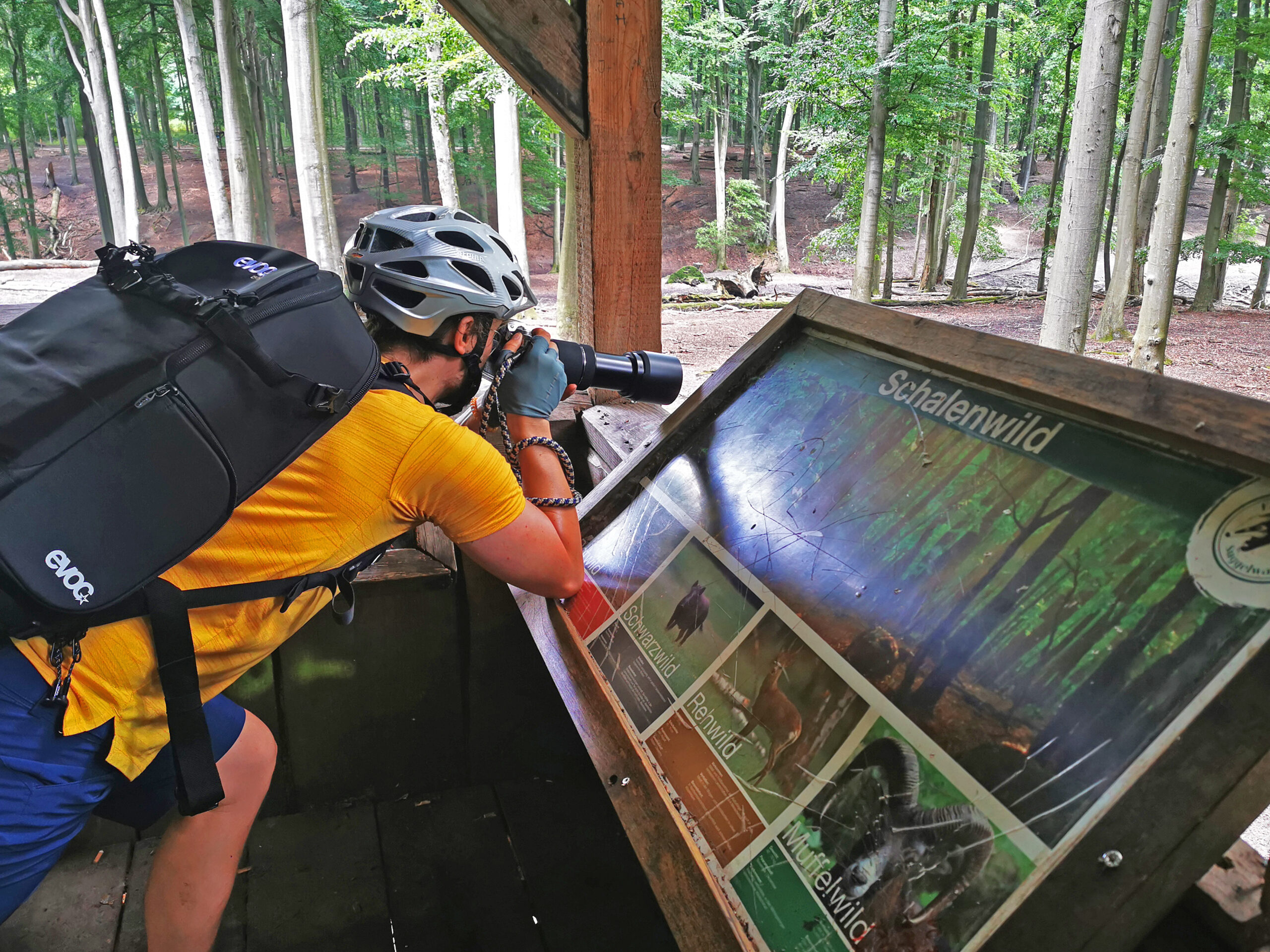 Nach der Abfahrt verlassen wir den Emscher-Weg und fahren zum Dortmund-Ems-Kanal, dem wir ein kurzes Stück vorbei an Hafenanlagen folgen. Dann biegen wir auf unserer Radtour durch Dortmund ab Richtung Osten und gelangen doch recht zügig in ein tolles Waldgebiet. Ja, auch das verbinden wohl die wenigsten Auswertigen mit Dortmund, aber die Waldwege lassen sich lässig cruisen und von einem Aussichtsturm können wir sogar Rehe beobachten – einfach ein tolles Naturerlebnis und das so nah an der Großstadt! Pascal geht natürlich gleich mit seinem Teleobjektiv auf „Jagd“ nach dem perfekten Foto. Gerade für Familien ist das Wildgehege natürlich ein prima Platz für eine kleine Erlebnispause.