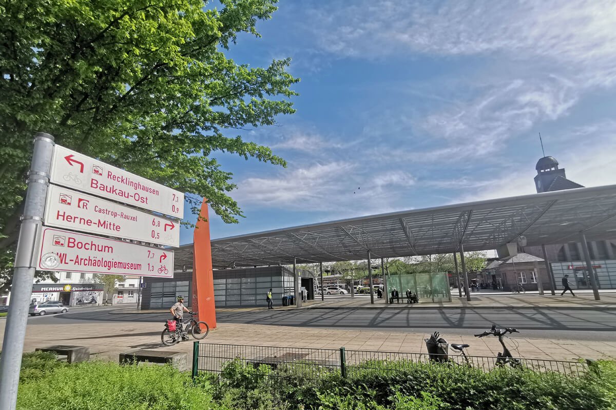 Die Anreise kann entspannt mit der Bahn erfolgen, denn die Tour startet direkt am Bahnhof in Herne. Südlich liegt zusätzlich ein großer Parkplatz, sodass auch die Anreise mit dem Auto denkbar wäre. Die Sonne lacht und Sandra und ich schwingen uns gut gelaunt auf unsere Räder. Ja, wir nutzen unsere E-Bikes, aber im Grunde genommen ist die Tour mit nur 240 Höhenmetern recht leicht zu fahren. Die meisten Highlights liegen direkt am Anfang der Tour, zum Ende hin wird dagegen eher das Radeln im Fokus stehen.