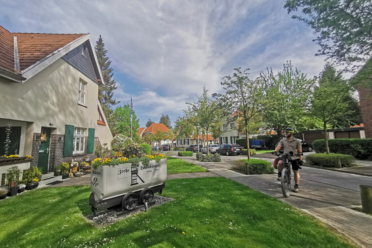 Sandra und ich radeln um das Gelände herum, dann geht’s direkt weiter zur ersten Arbeitersiedlung. Schnell erreichen wir die wunderschöne Zechensiedlung Teutoburgia. Langsam fahren wir an den Wohnhäusern vorbei. Es ist toll, wie liebevoll viele Anwohner ihr Haus herausgeputzt und ihre Vorgärten mit Blumen verziert haben.