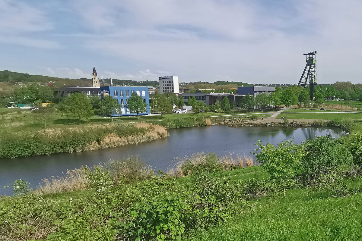 Für mich ist es immer wieder faszinierend, wie schnell man selbst in den Städten plötzlich mitten im Grünen ist. Nur wenige Pedalumdrehungen im Stadtverkehr, schon fahren wir durch den Stadtgarten, der uns zum Zechengelände Mont Cenis führt. Reste der ehemaligen Zeche finden sich in der Parklandschaft, Infotafeln erklären uns die Geschichte. Heute steht auf dem Gelände mit der Akademie Mont-Cenis eine der bedeutendsten Fortbildungsstätten in NRW. Besonders die außergewöhnliche, mediterran wirkende Architektur begeistert viele Besucher.