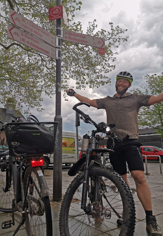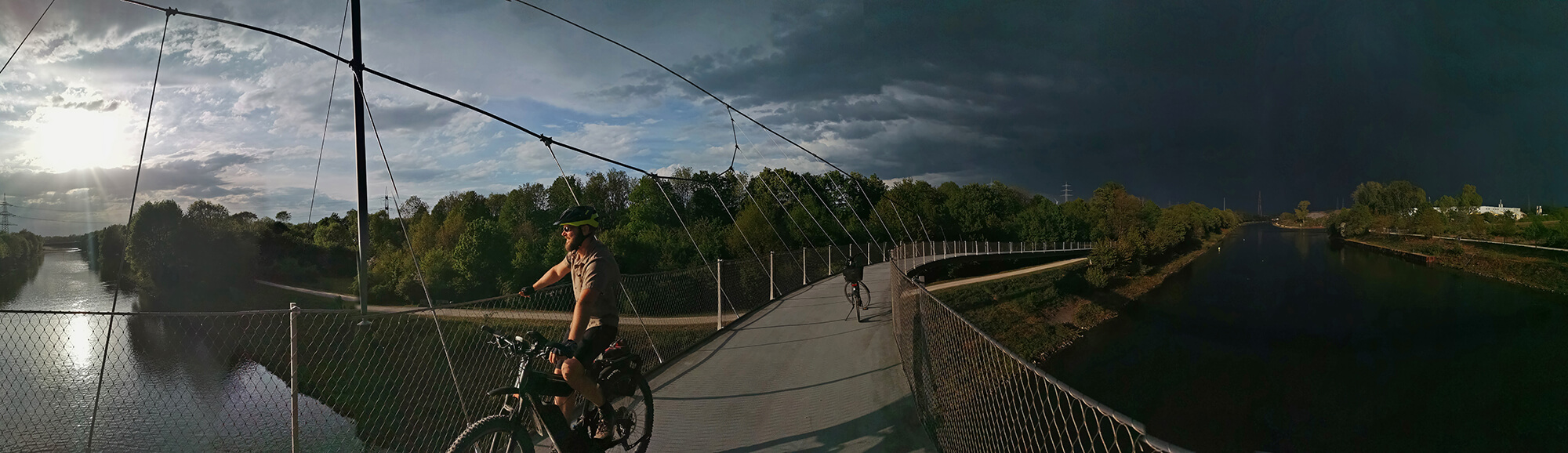 In Bochum führt die Tour durch die Zechensiedlung Dahlhauser Heide, bevor wir uns auf die Erzbahntrasse begeben. Eigentlich steht die für entspanntes Bahntrassenradeln im Ruhrgebiet, aber hinter uns braut sich ein ordentliches Gewitter zusammen. Es wird dunkler und das Grollen der Donner immer lauter. Sandra und ich freuen uns, dass wir quasi vor dem Gewitter davonradeln, bis wir auf der Grimberger Sichel über dem Rhein-Herne-Kanal direkt auf der Wetterscheide zu stehen scheinen – absolut beeindruckend. Blöd nur, wenn die Tour nicht Richtung Sonne führt, sondern rein ins dunkle Gewitter.